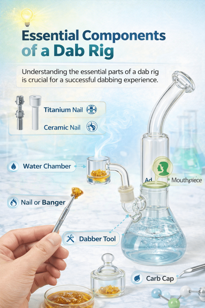 To use a dab rig effectively, it’s important to understand the different components and how they work together to vaporize cannabis concentrates. Here’s a breakdown of the key parts of a dab rig: