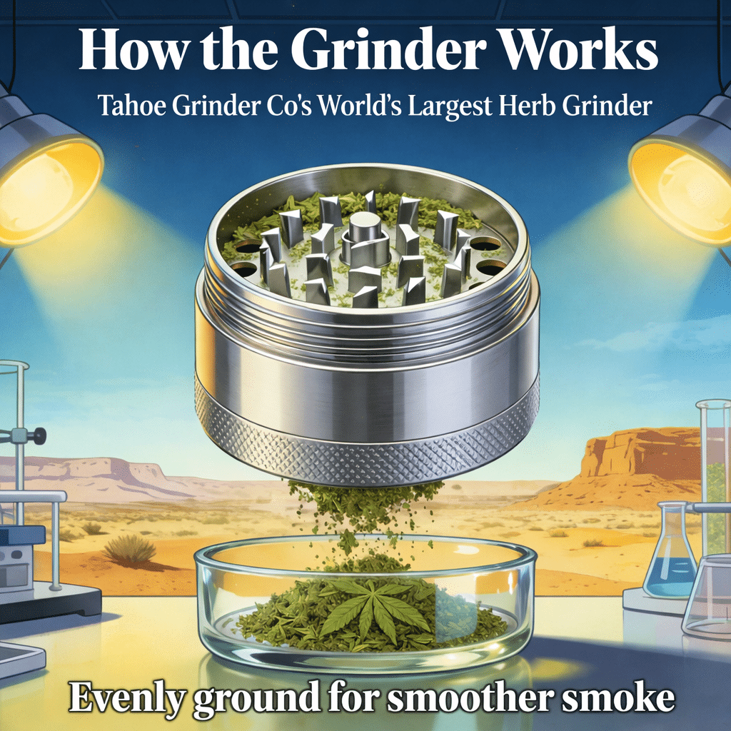 Using Tahoe Grinder Co’s world’s largest weed grinder is incredibly easy. Simply remove the top part of the grinder and add your weed. Replace the top part of the grinder and turn the handle in a clockwise direction. The sharp teeth in the top part of the grinder will grind up the weed, and the ground-up weed will fall through the holes in the bottom part of the grinder and be collected in a separate container.