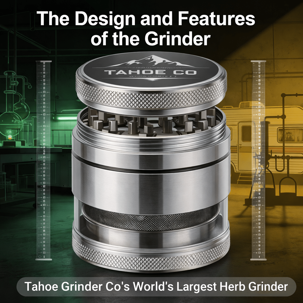 Tahoe Grinder Co’s world’s largest weed grinder is a wonder to behold. Standing at 8 inches tall, 16-inch diameter and weighing over 40 pounds, this grinder is a true heavyweight in the world of cannabis accessories. The grinder is made from high-quality materials, including aircraft-grade aluminum and stainless steel, which ensures that it can withstand the wear and tear of daily use. The top of the grinder features a large handle that makes it easy to turn, even when the grinder is full of weed.