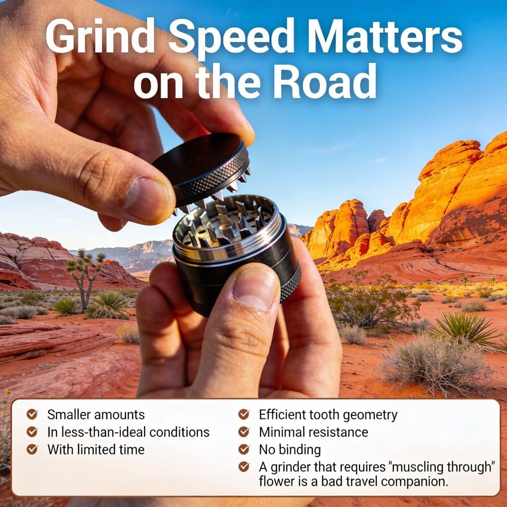 A grinder that requires “muscling through” flower is a bad travel companion.