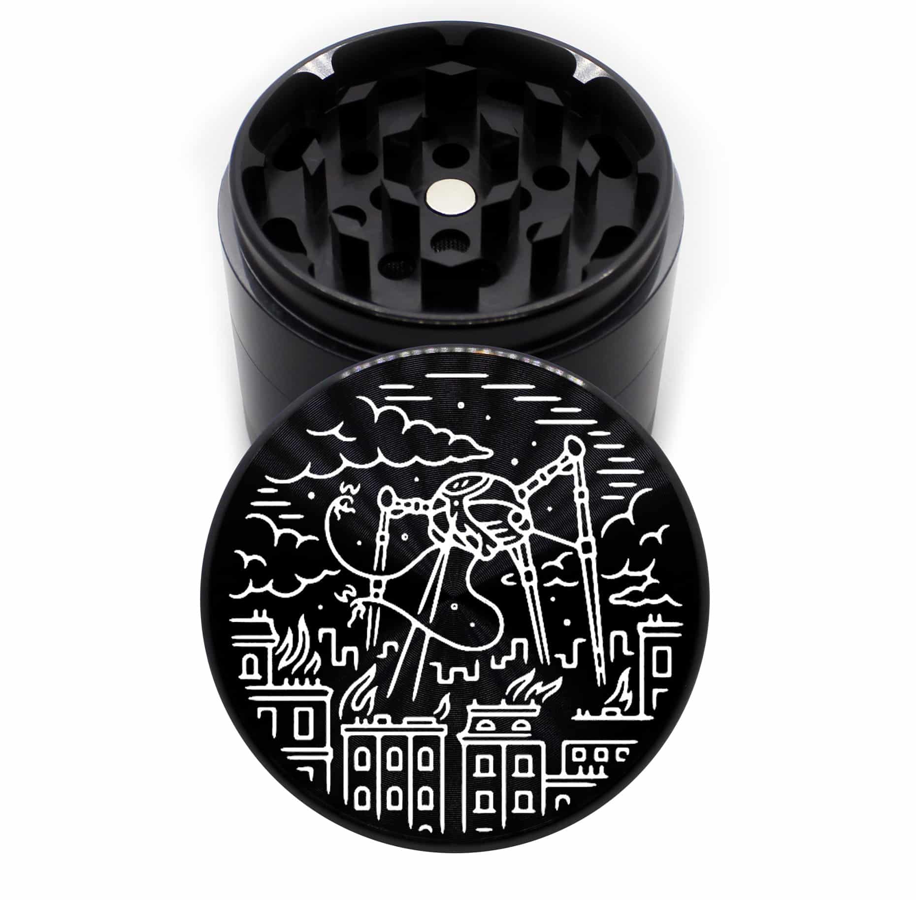 Aliens Design 63mm Black CNC Cannabis Grinder – 4 Piece