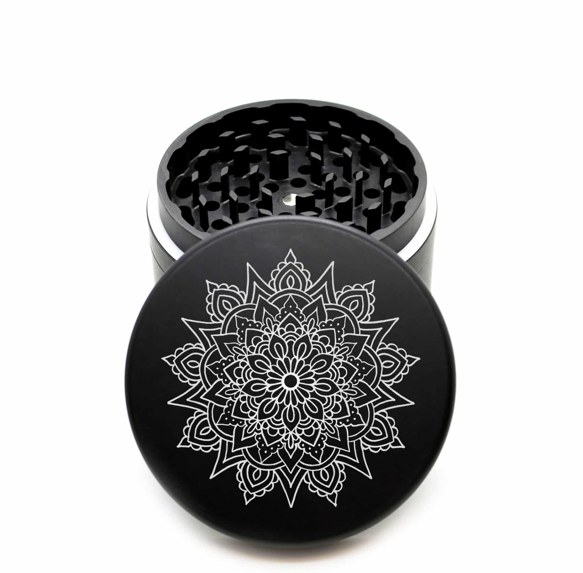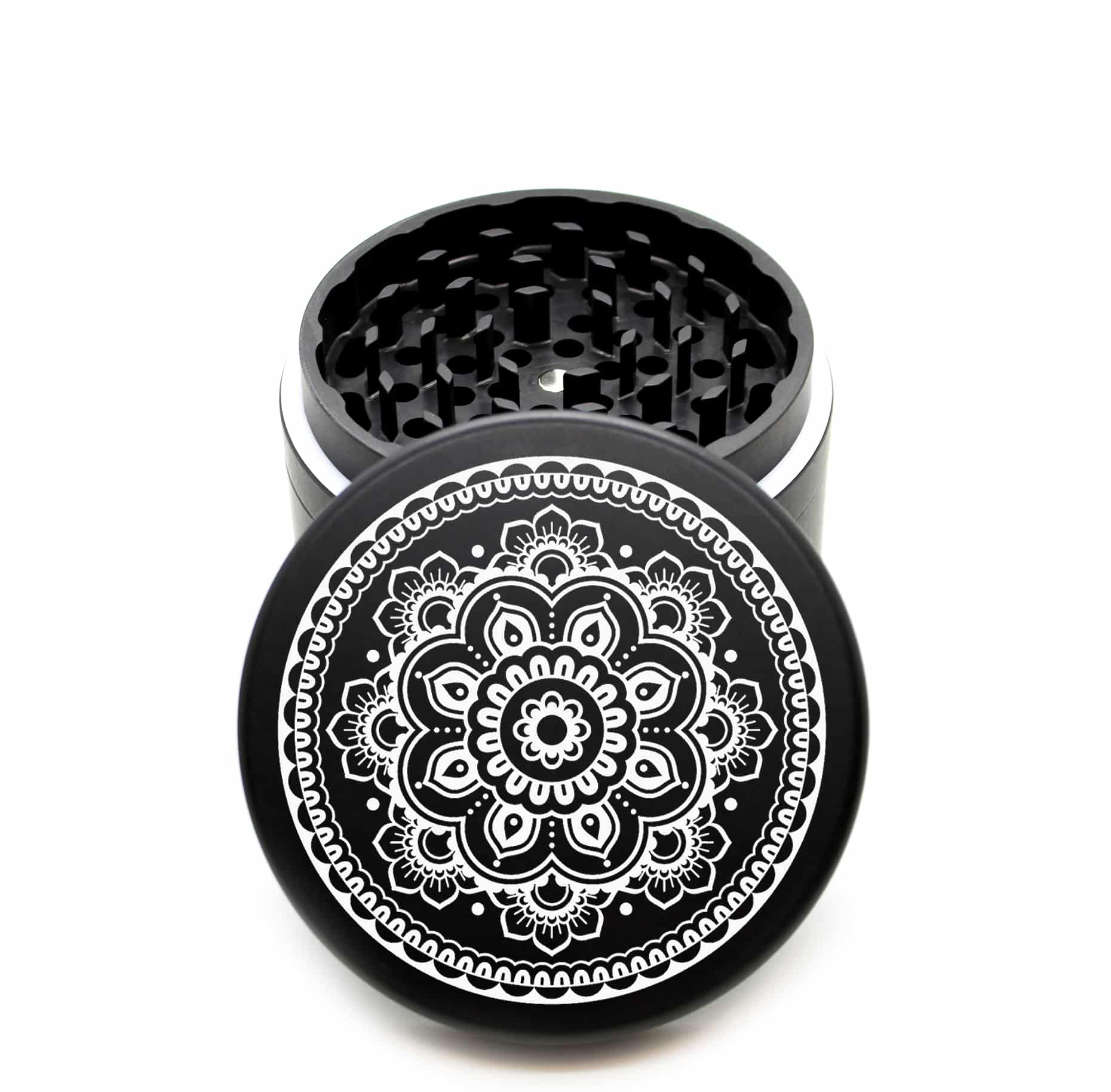 USA Made The Puck® Grinder: Sharktooth Mandala – Premium 90mm Black Weed Grinder