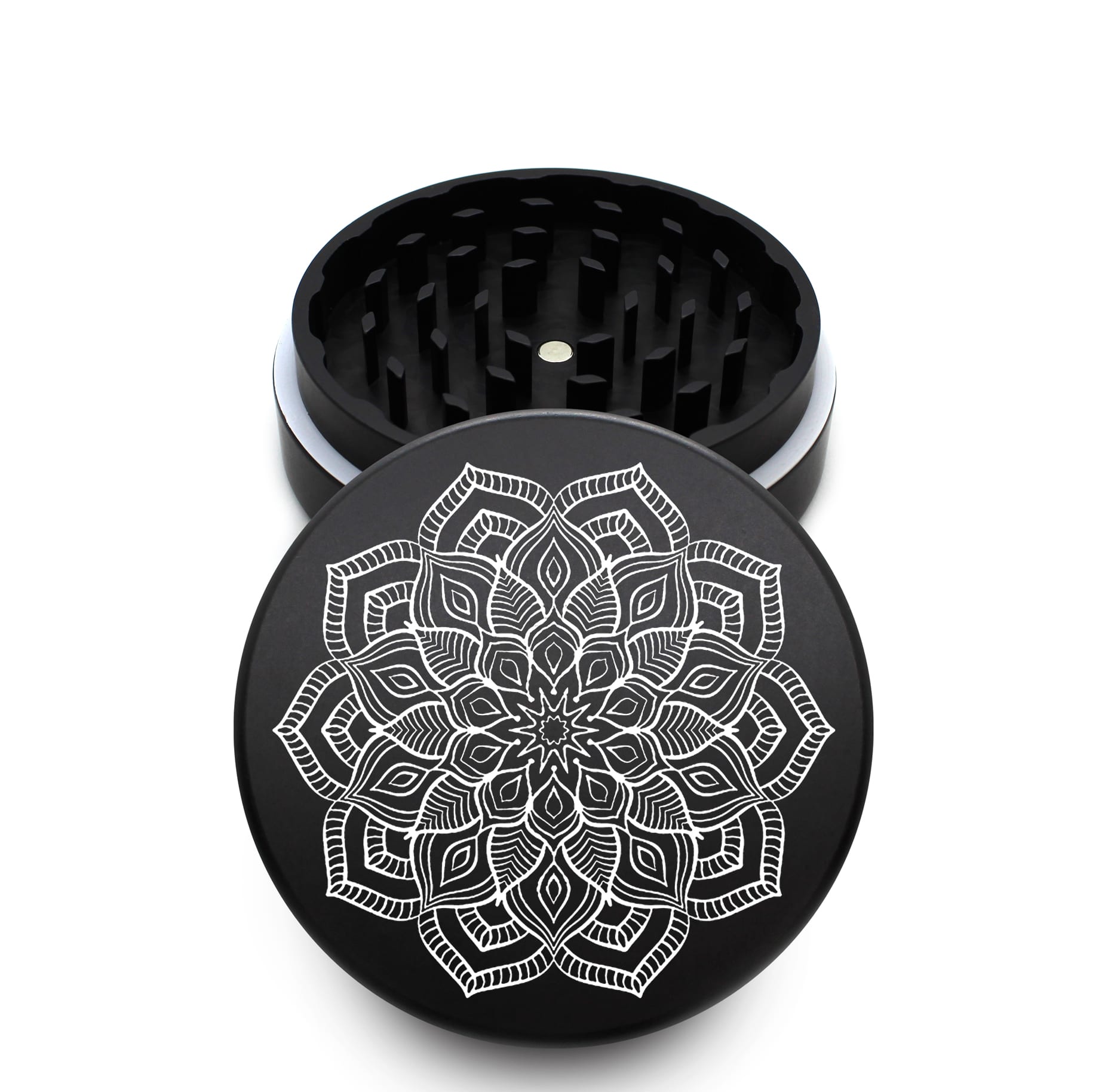 USA Made The Puck® Grinder: Zinnia Mandala, Black, 3.500 inch [90mm], 2 Piece