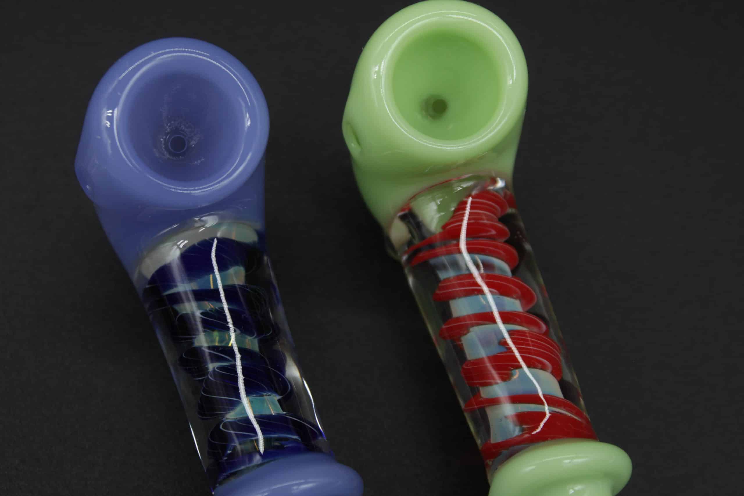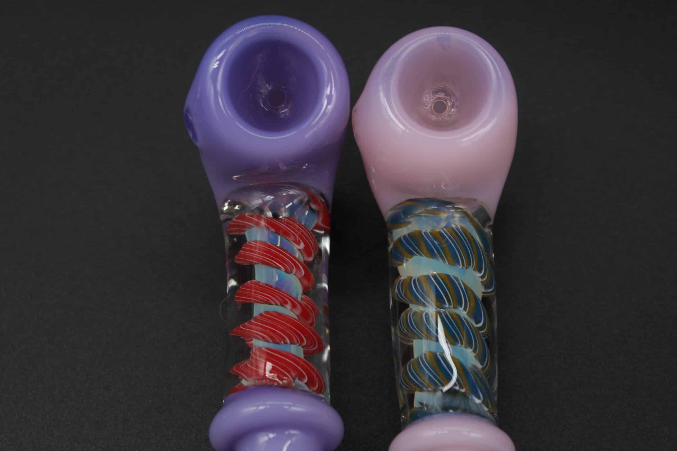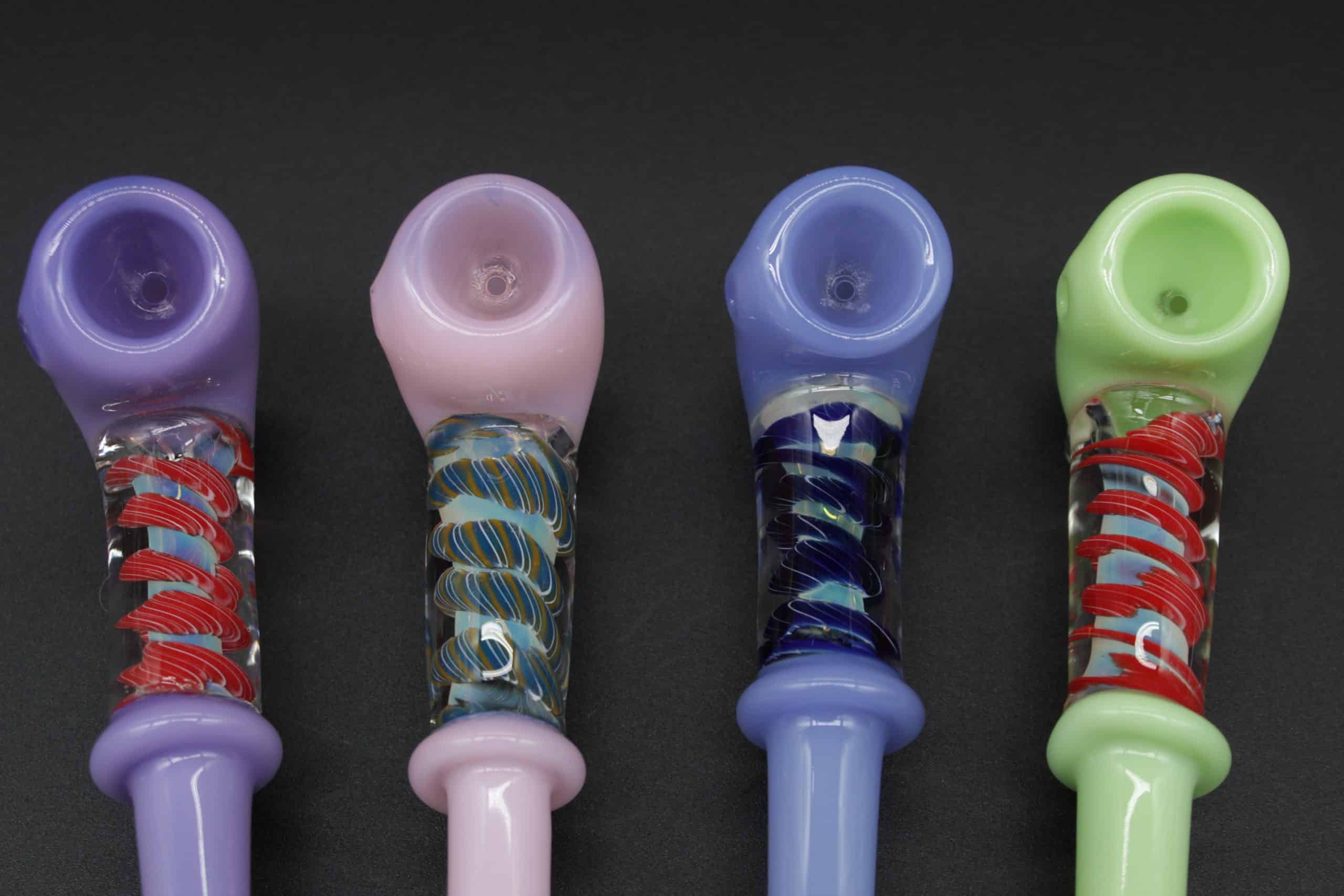 Each pipe includes a 1-inch bowl, side carb hole for airflow control, and two small stabilizing glass feet on the underside to help the pipe rest more securely on flat surfaces. Available in soft pastel tones with artistic internal coil detailing, these pipes are as collectible as they are functional.