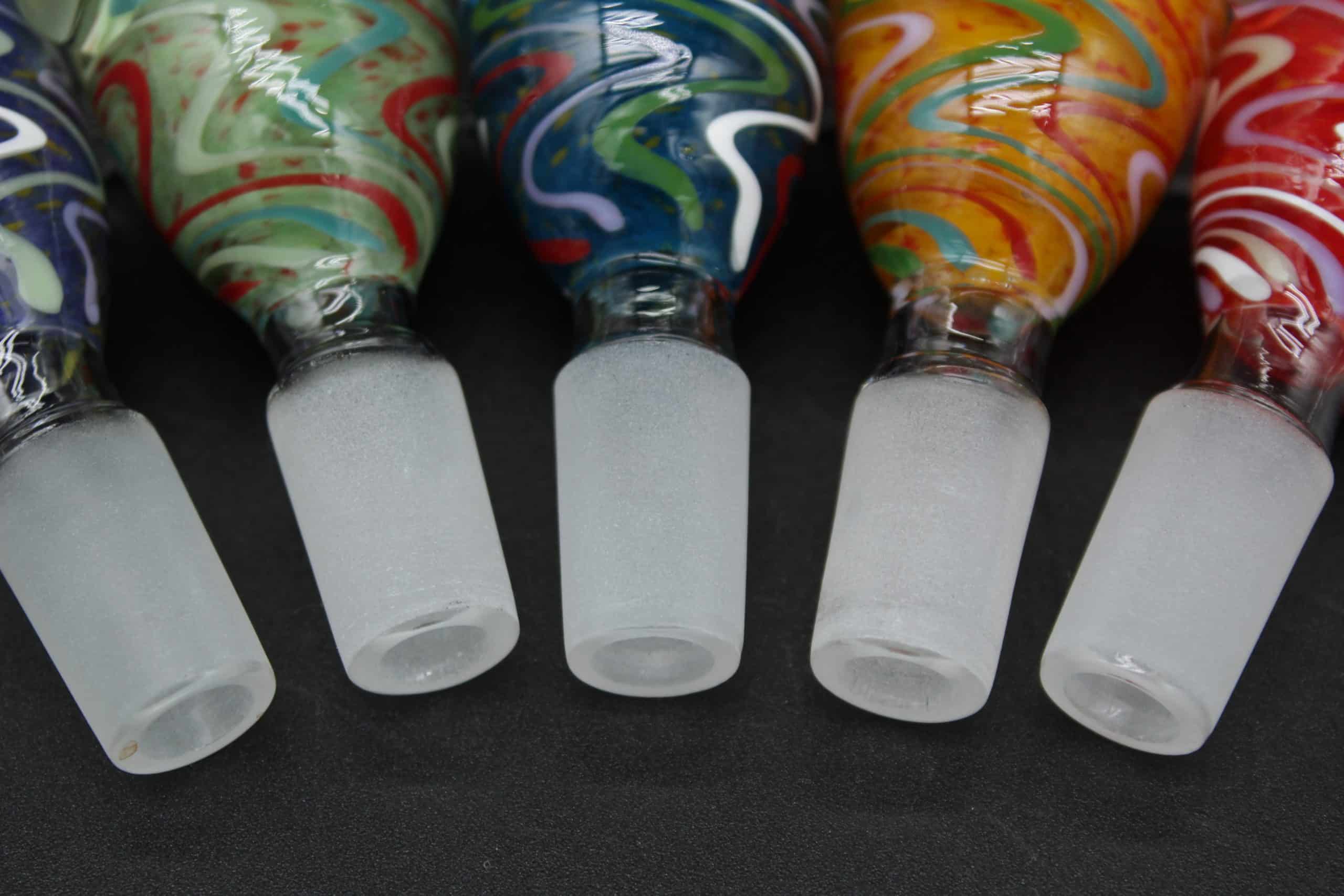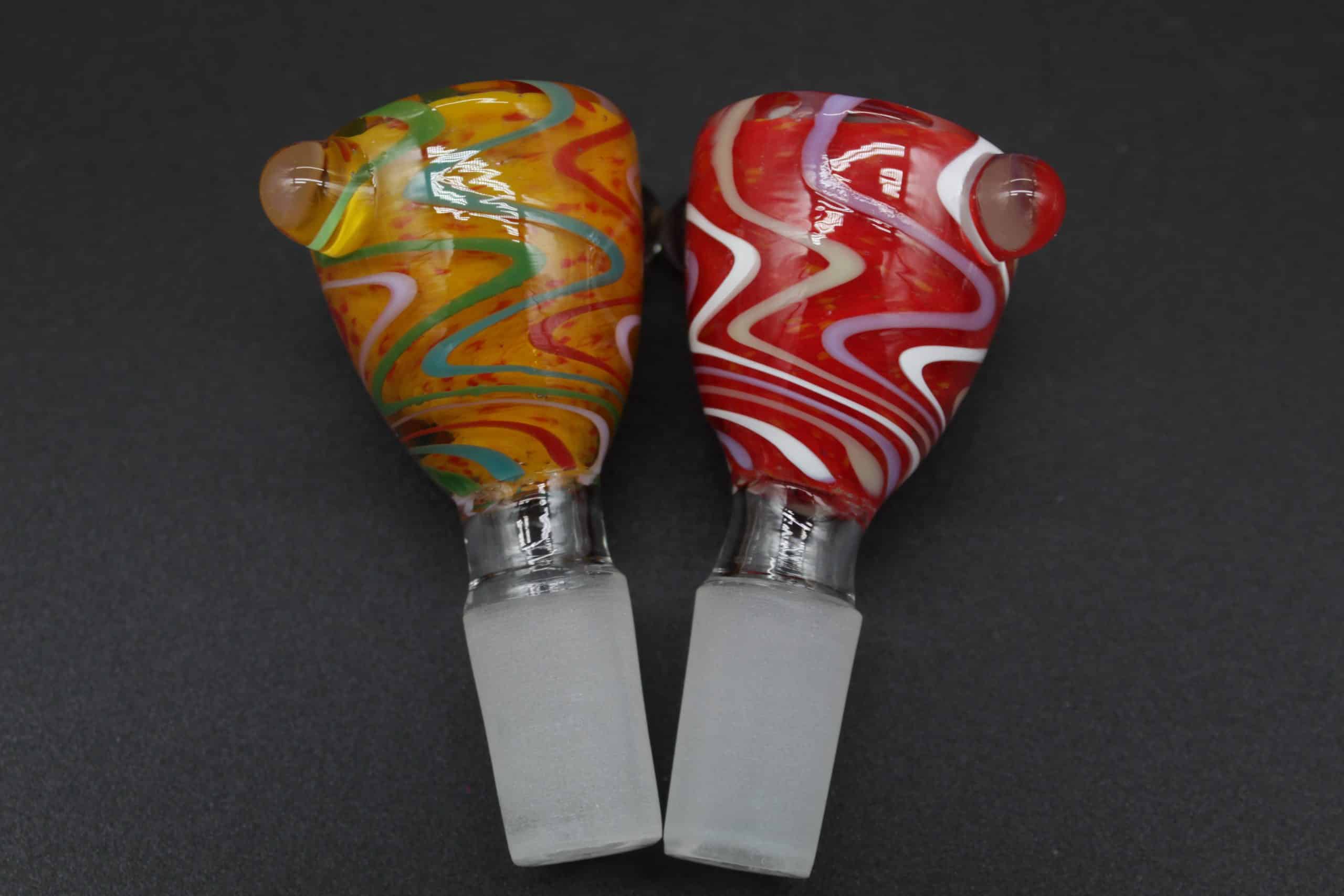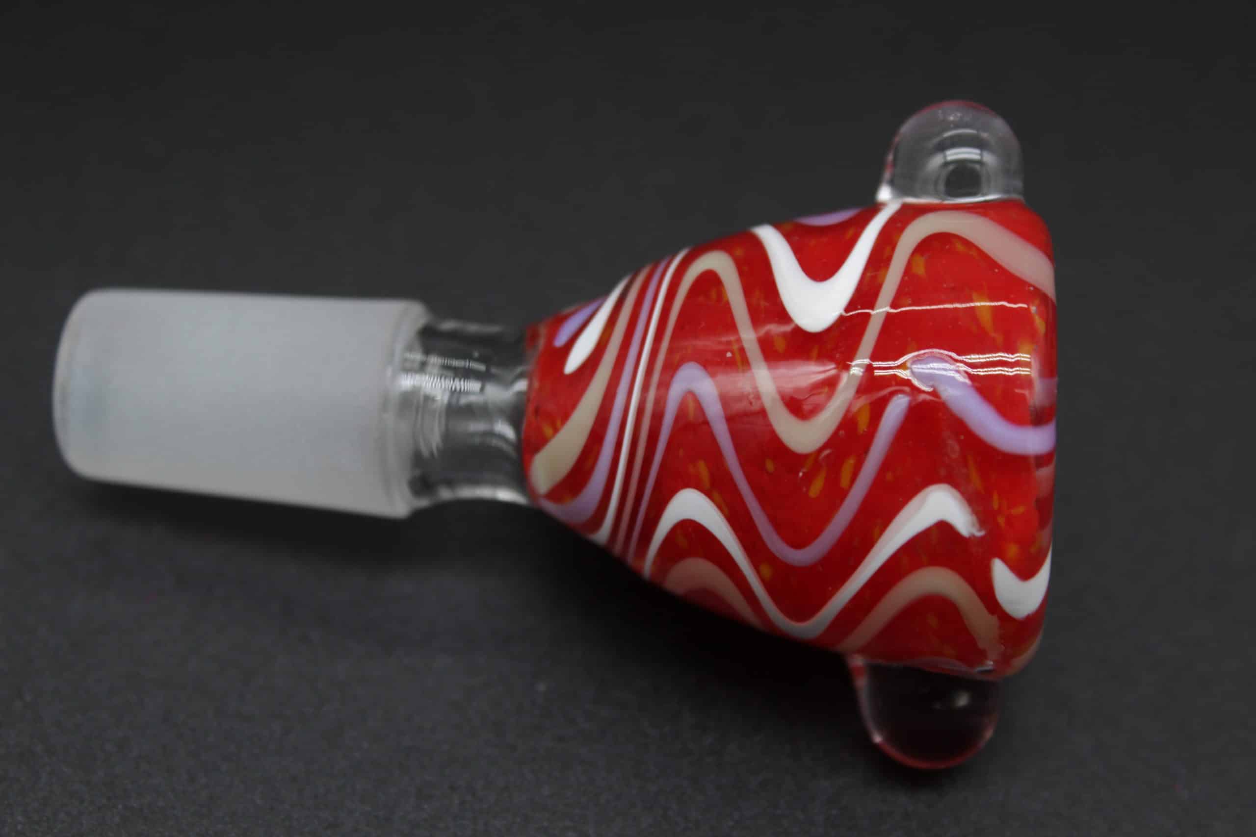 The frosted 14mm male joint fits any compatible 14mm female water pipe, bong, bubbler, or rig. Dual built-in glass side bumps act as convenient pull handles, allowing easier removal when warm while also adding balance, grip, and visual appeal.