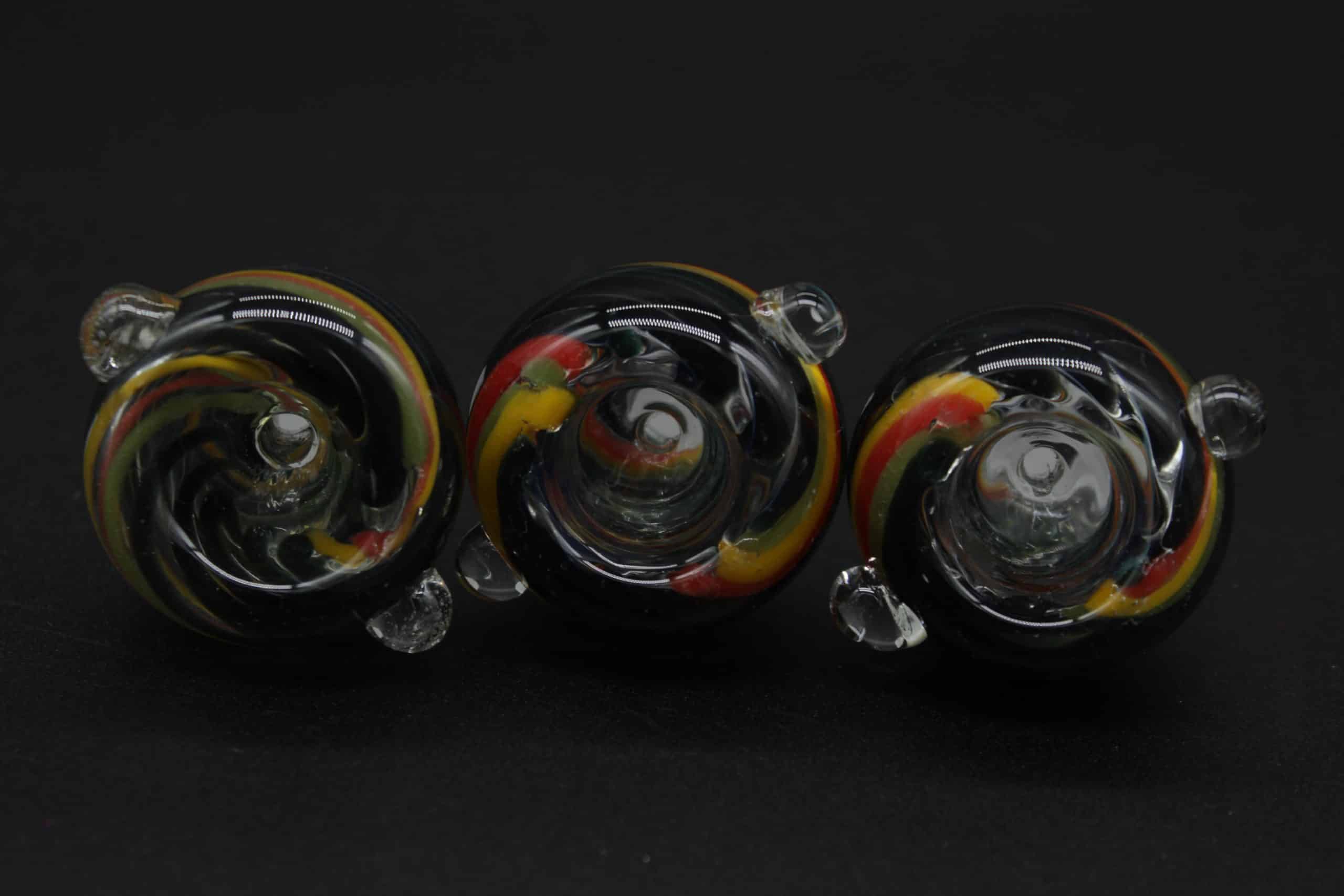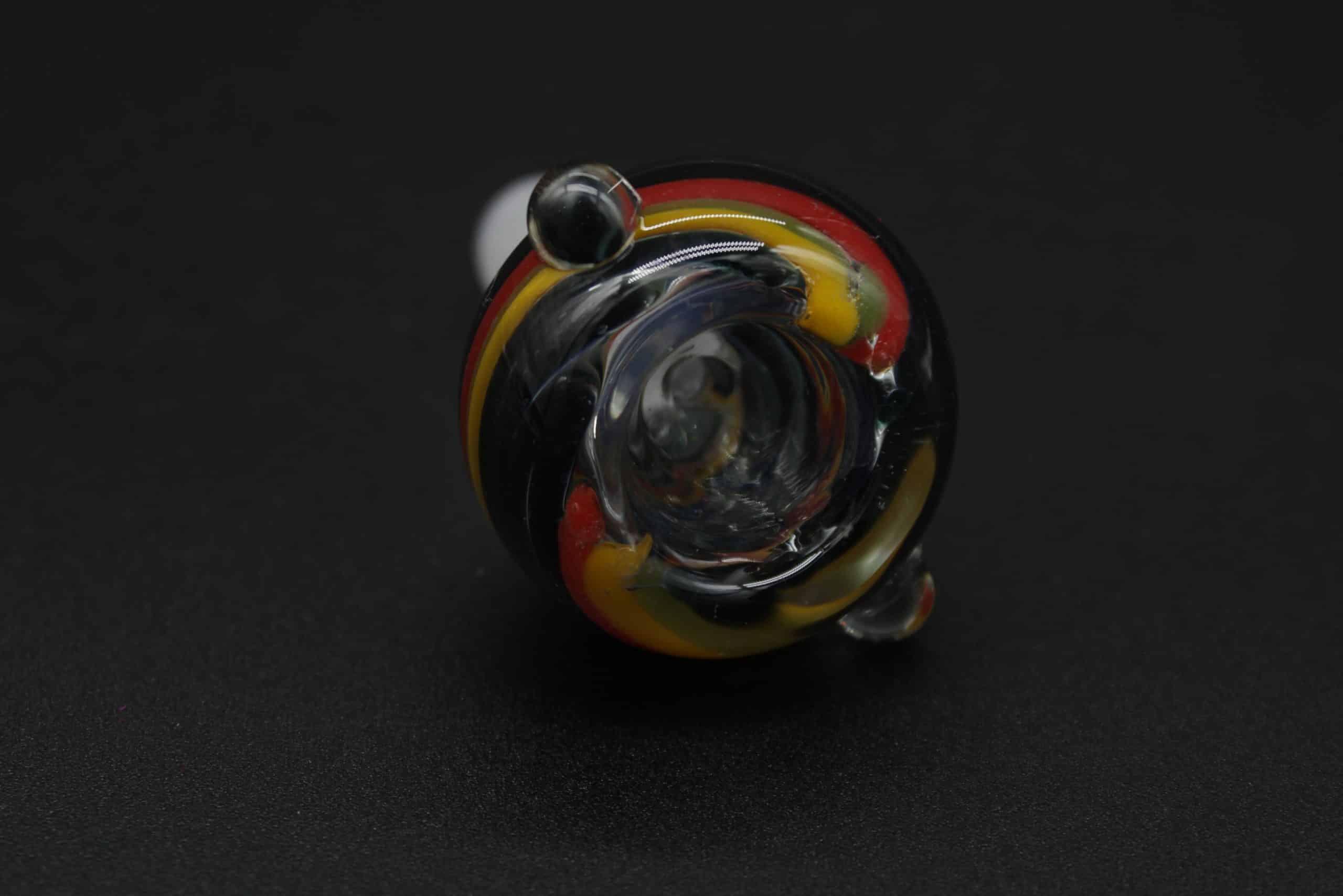 Crafted from durable borosilicate glass, this bowl features a rich black base with vibrant Rasta-inspired red, yellow, and green swirl accents wrapped around the body. The rounded bowl chamber offers solid pack capacity, while the built-in side handle makes removal quick, easy, and safer—even when the bowl is hot.