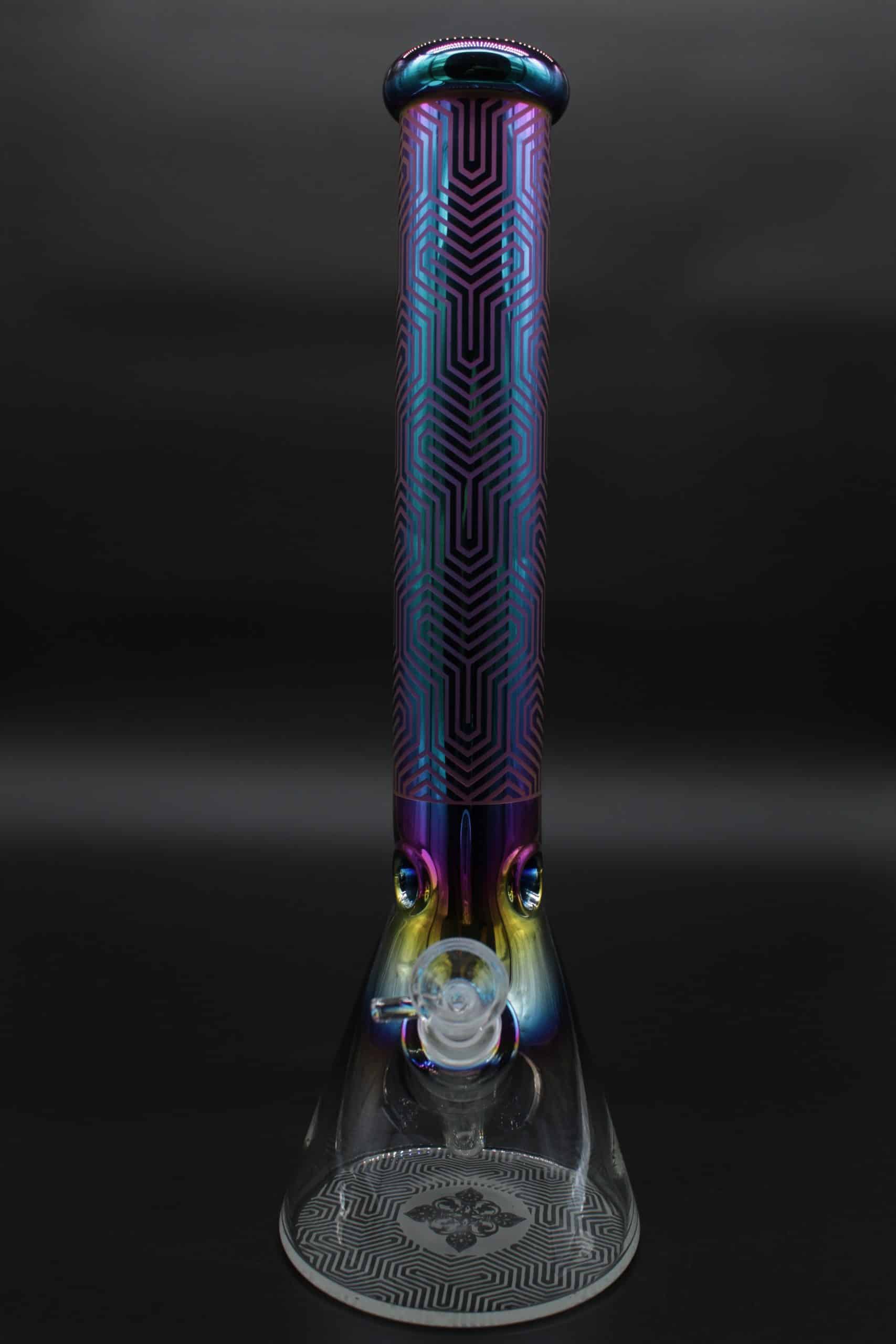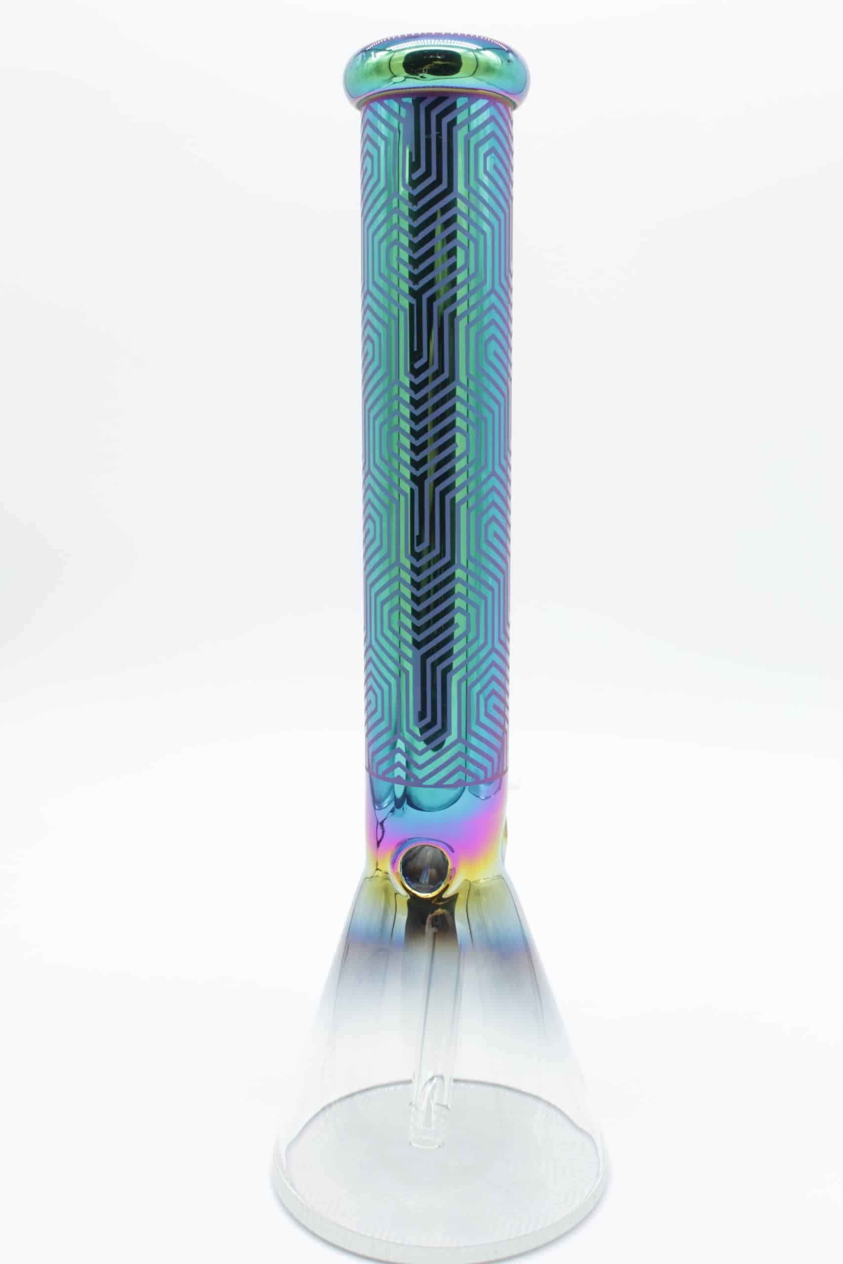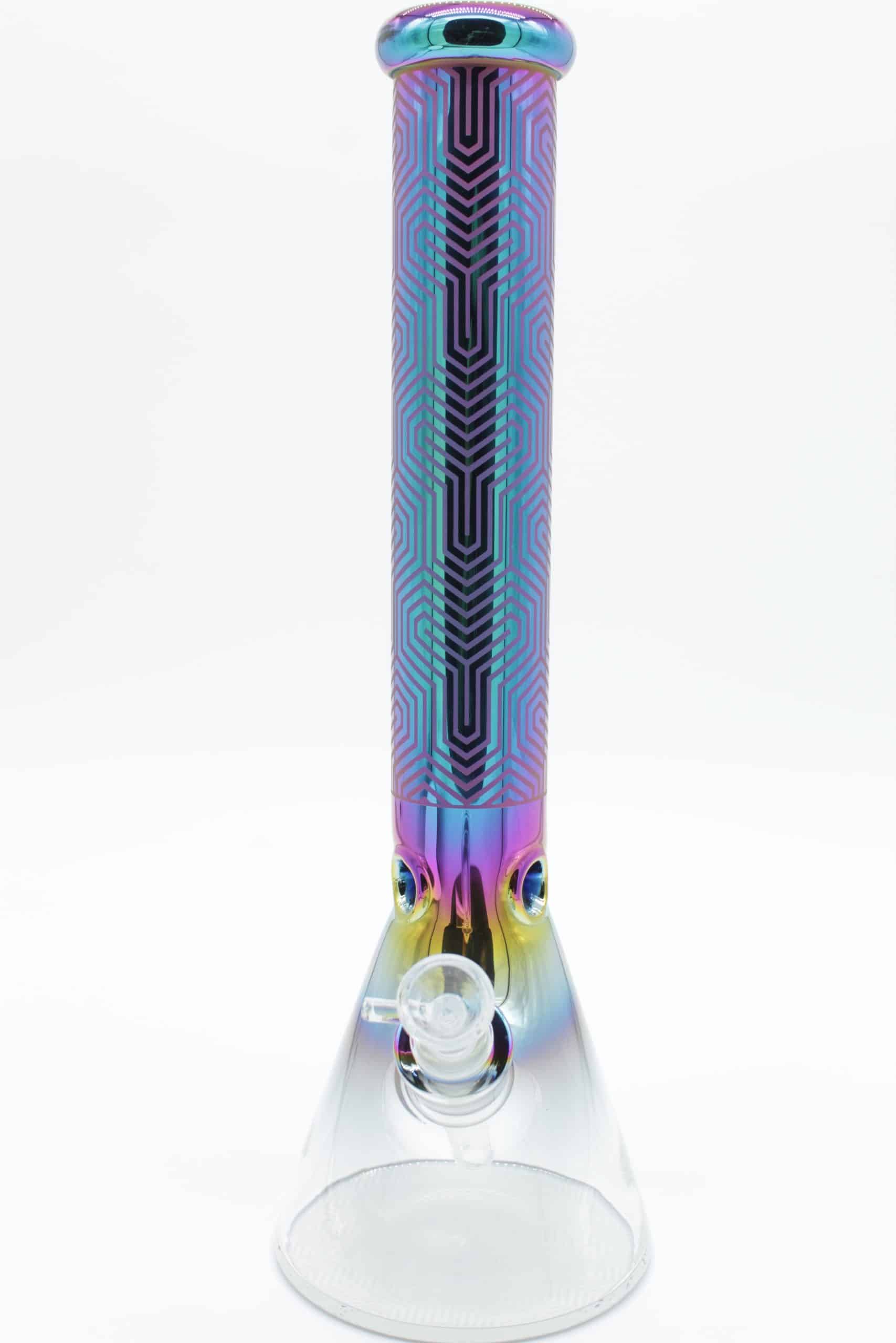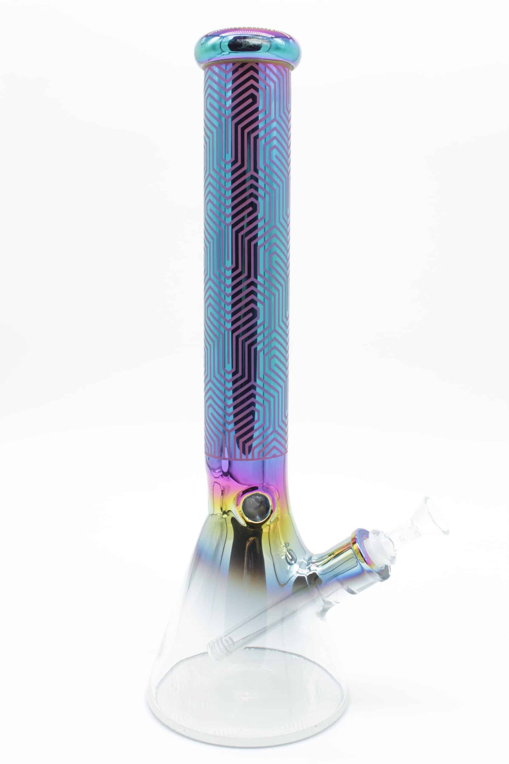 Elevate your smoking setup with this striking 16 Inch Seamless Beaker Bong, a premium glass water pipe designed to combine bold style, thick borosilicate construction, and smooth performance. Featuring a shimmering iridescent finish with a detailed geometric art deco pattern, this piece stands out instantly while delivering the classic function smokers trust from a large beaker bong.