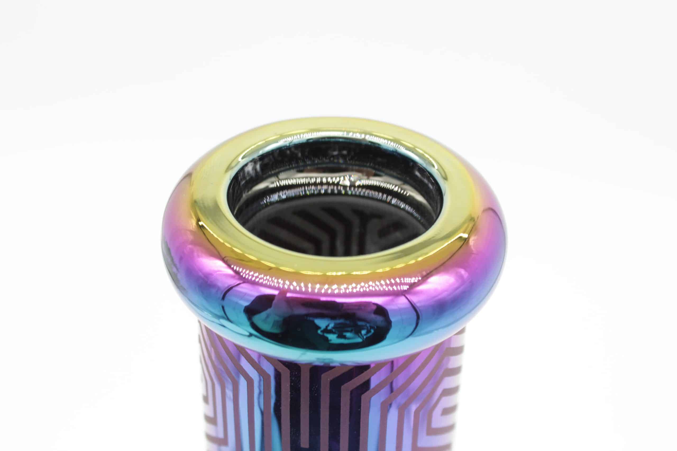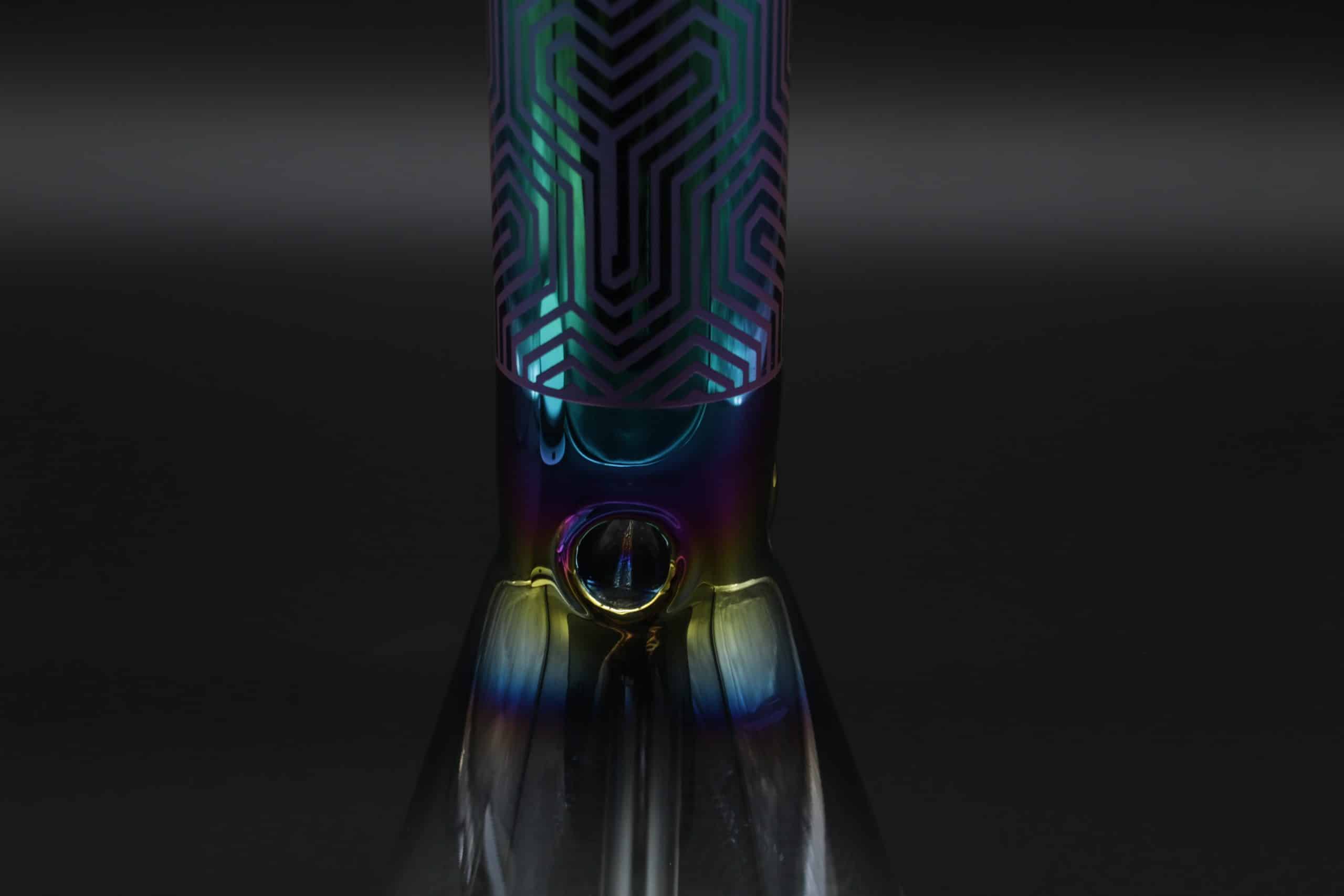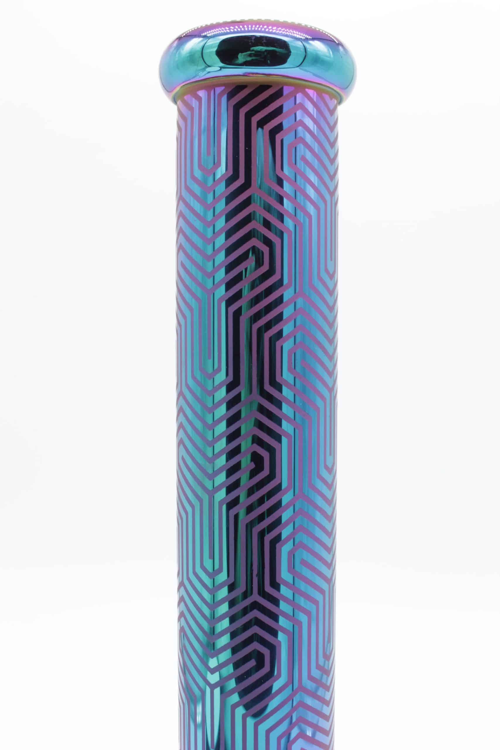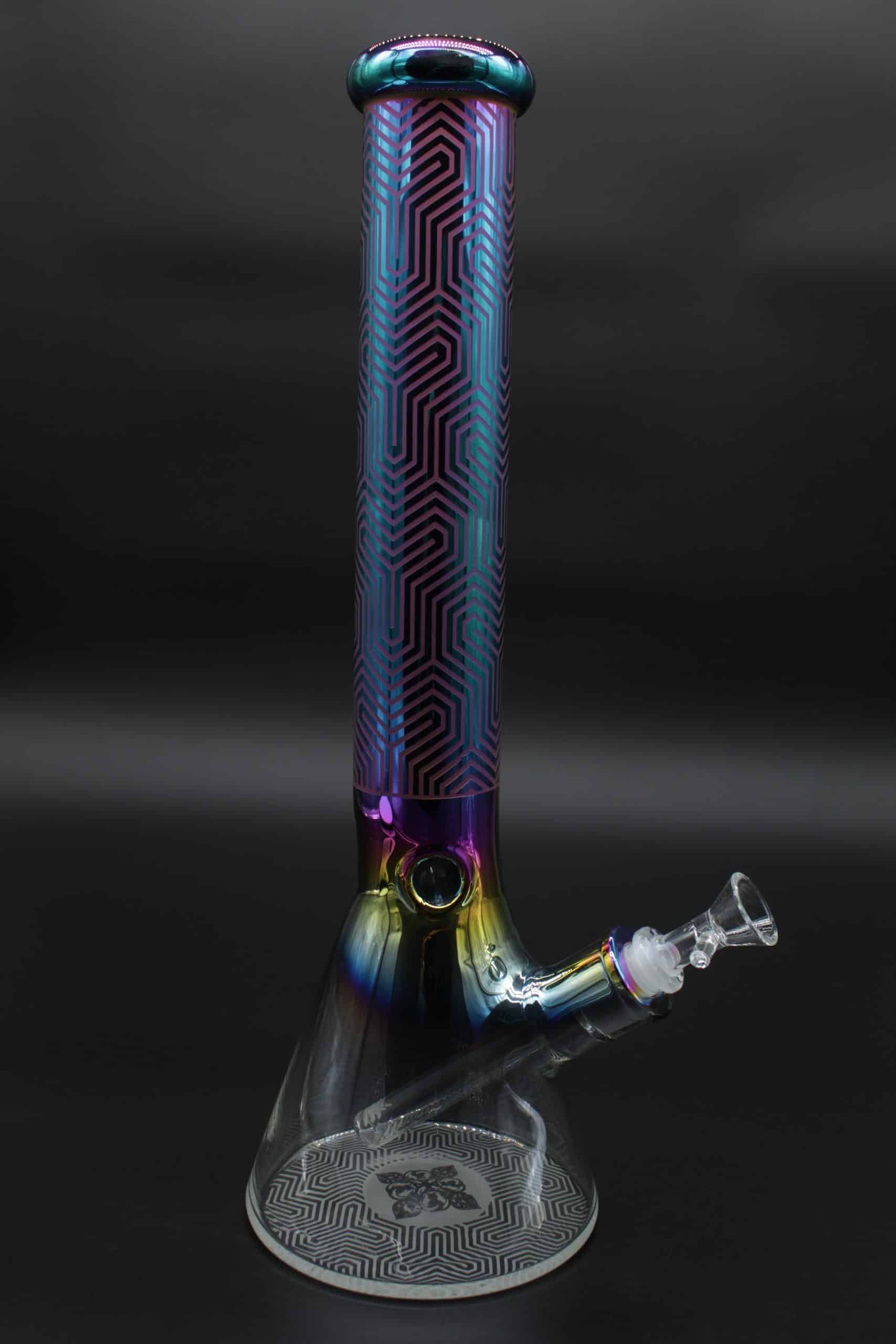 Elevate your smoking setup with this striking 16 Inch Seamless Beaker Bong, a premium glass water pipe designed to combine bold style, thick borosilicate construction, and smooth performance. Featuring a shimmering iridescent finish with a detailed geometric art deco pattern, this piece stands out instantly while delivering the classic function smokers trust from a large beaker bong.