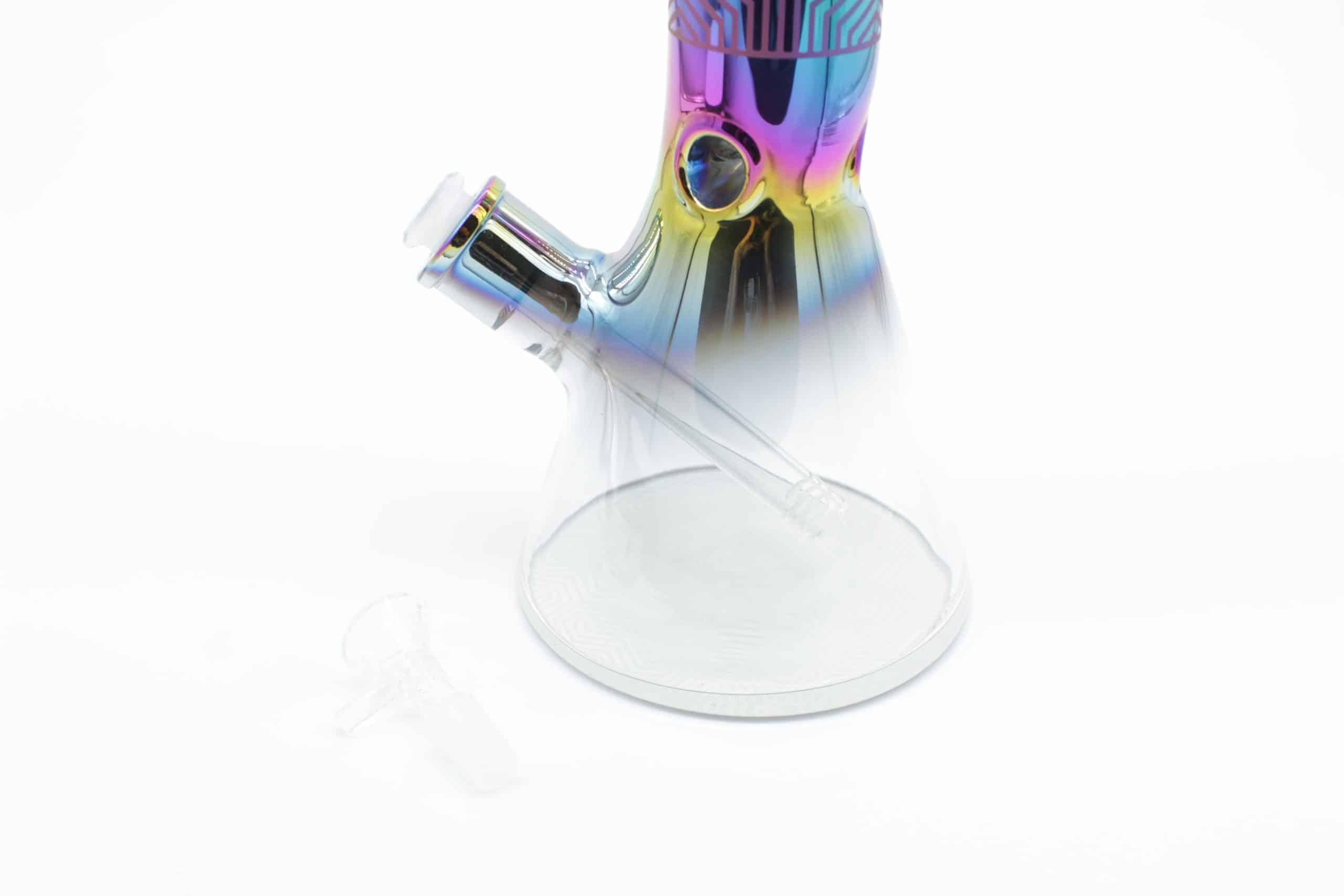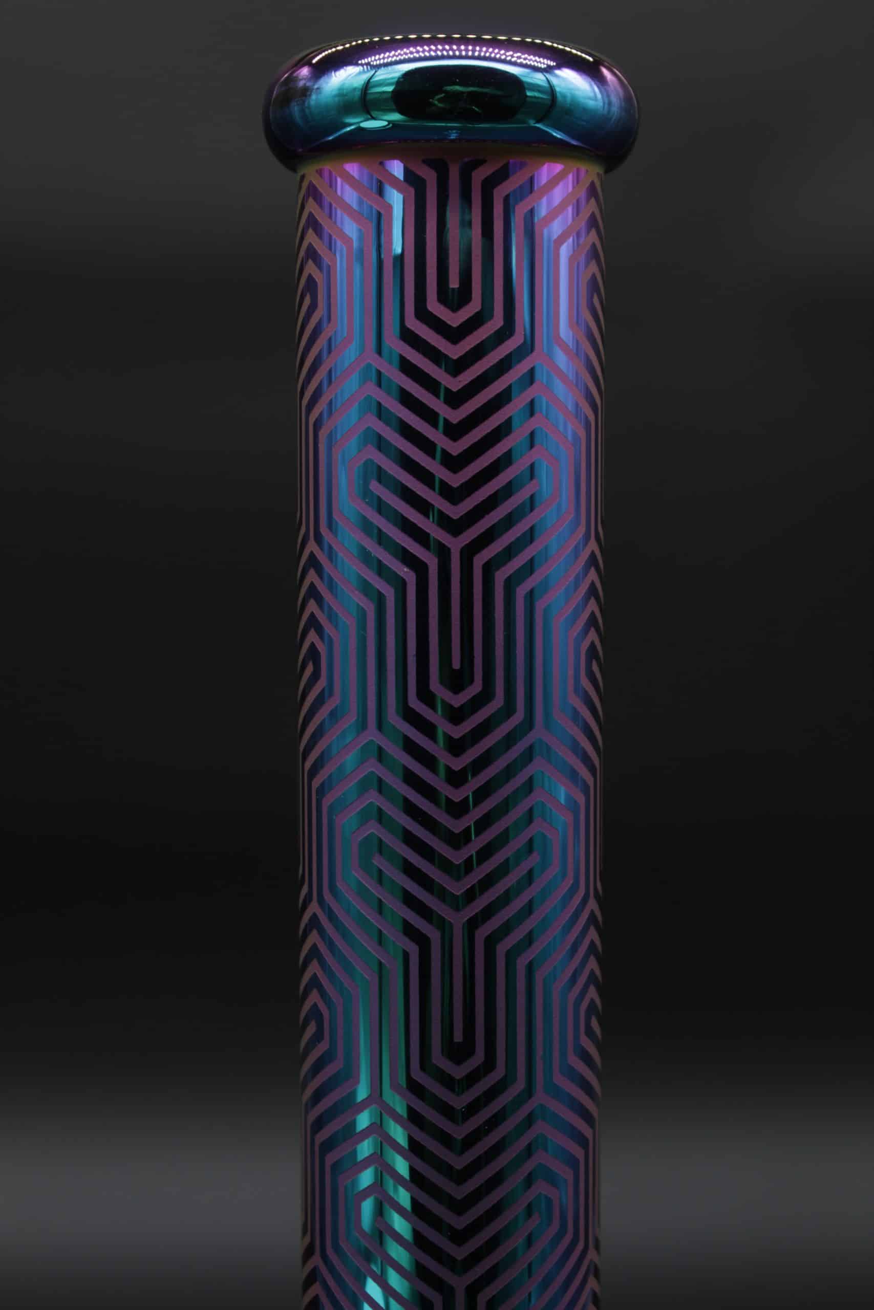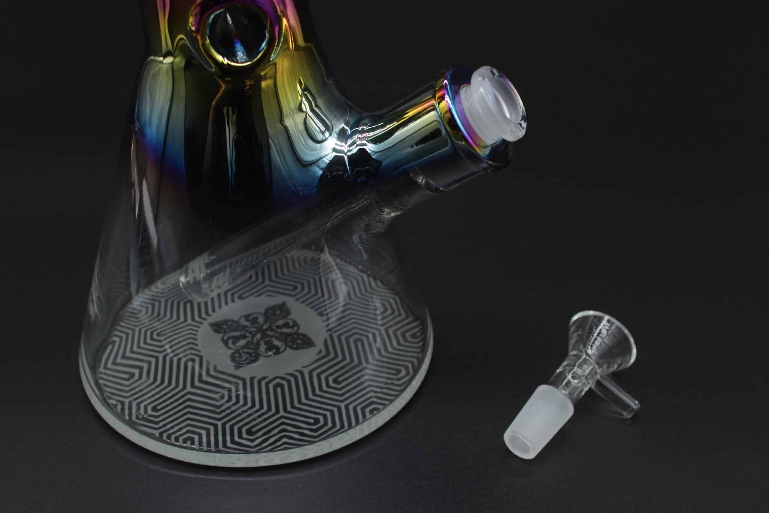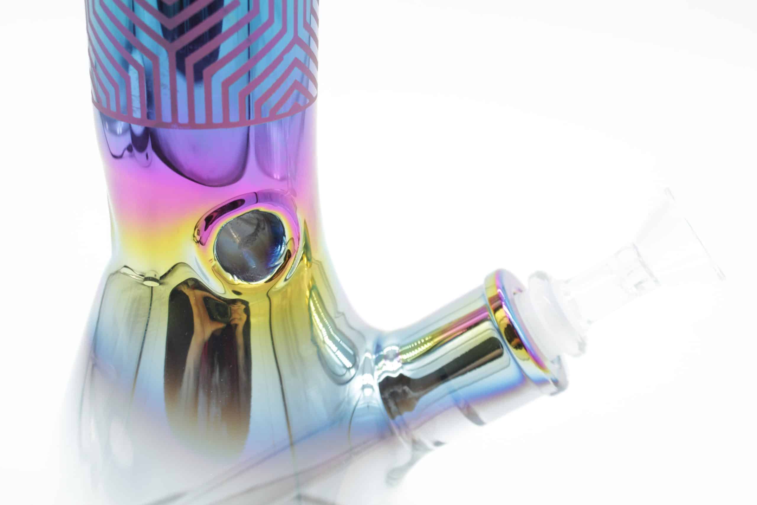 Elevate your smoking setup with this striking 16 Inch Seamless Beaker Bong, a premium glass water pipe designed to combine bold style, thick borosilicate construction, and smooth performance. Featuring a shimmering iridescent finish with a detailed geometric art deco pattern, this piece stands out instantly while delivering the classic function smokers trust from a large beaker bong.