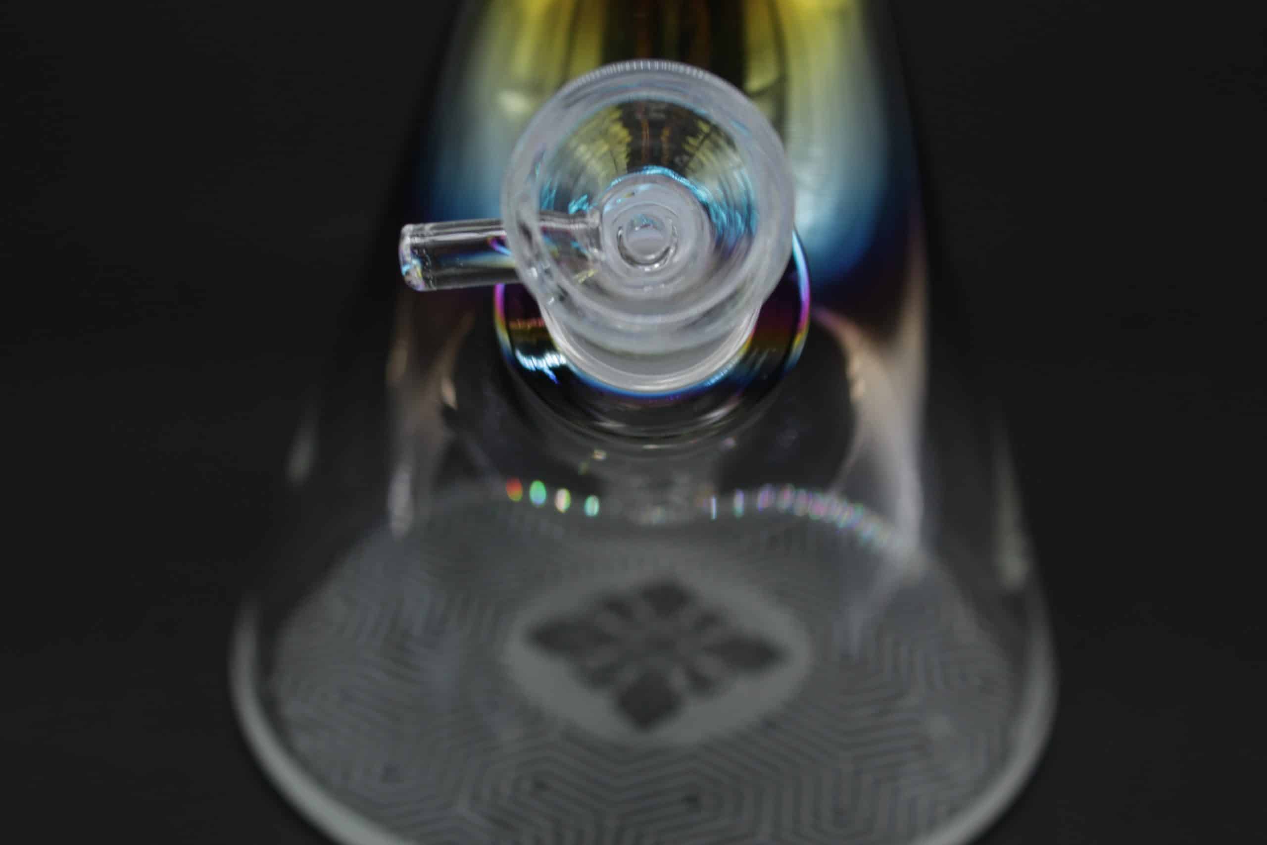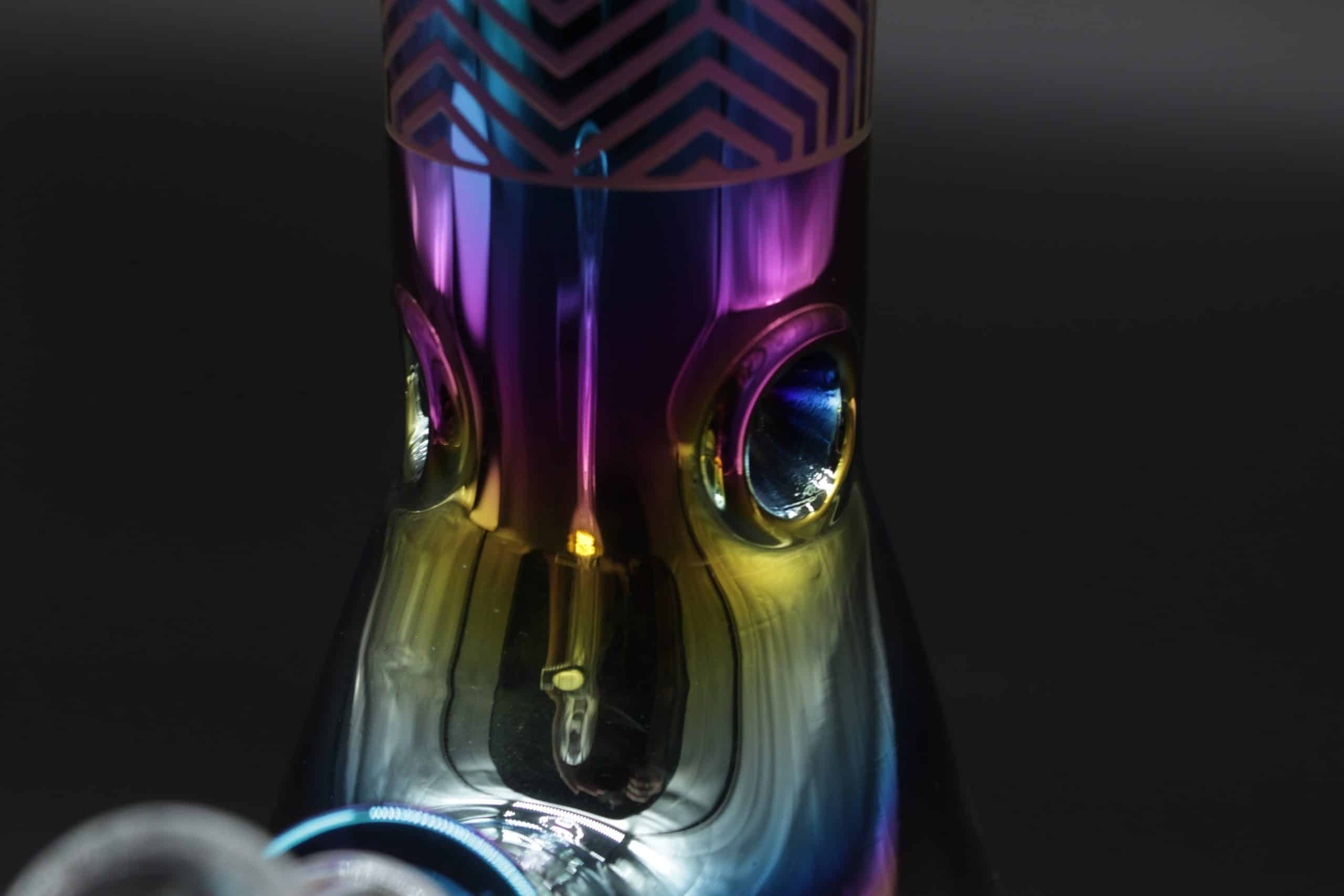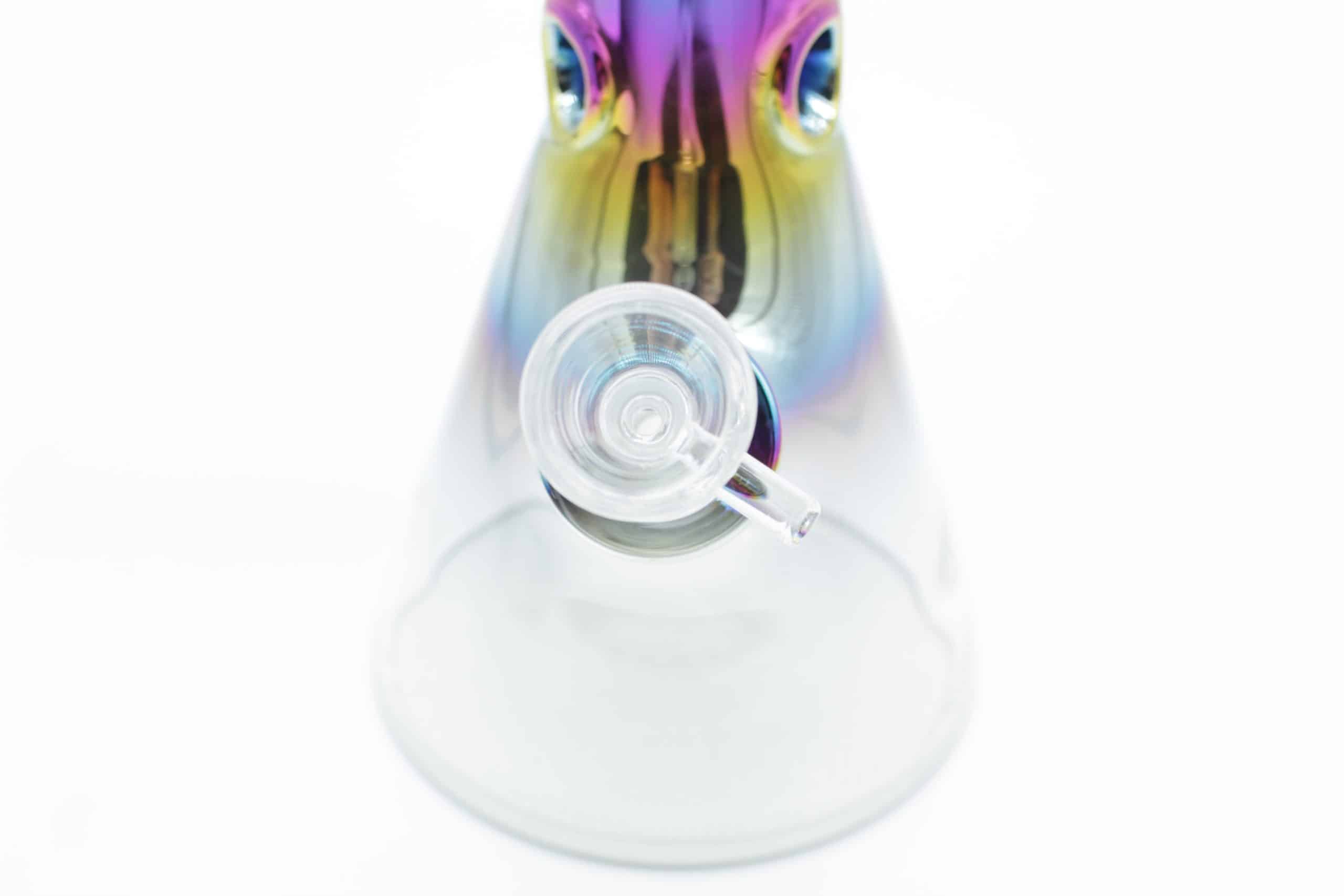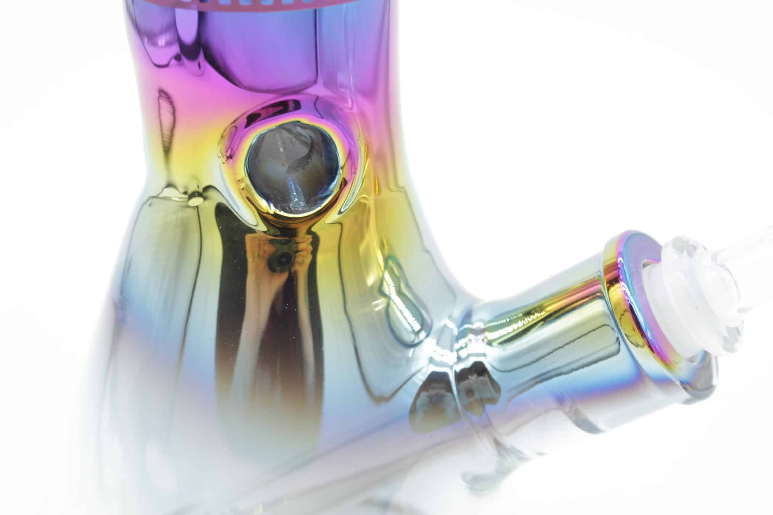 Elevate your smoking setup with this striking 16 Inch Seamless Beaker Bong, a premium glass water pipe designed to combine bold style, thick borosilicate construction, and smooth performance. Featuring a shimmering iridescent finish with a detailed geometric art deco pattern, this piece stands out instantly while delivering the classic function smokers trust from a large beaker bong.