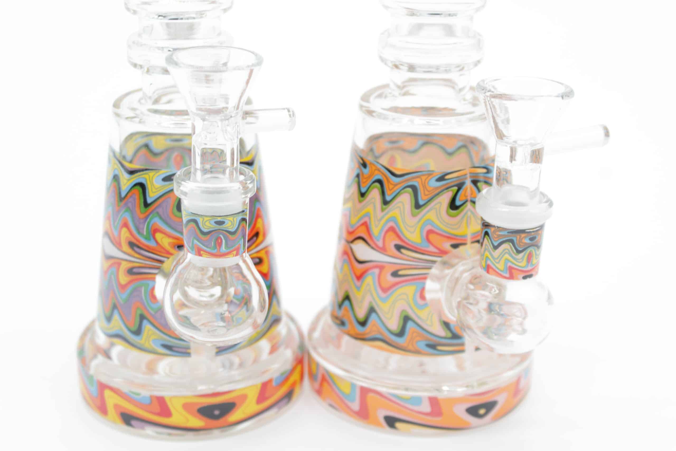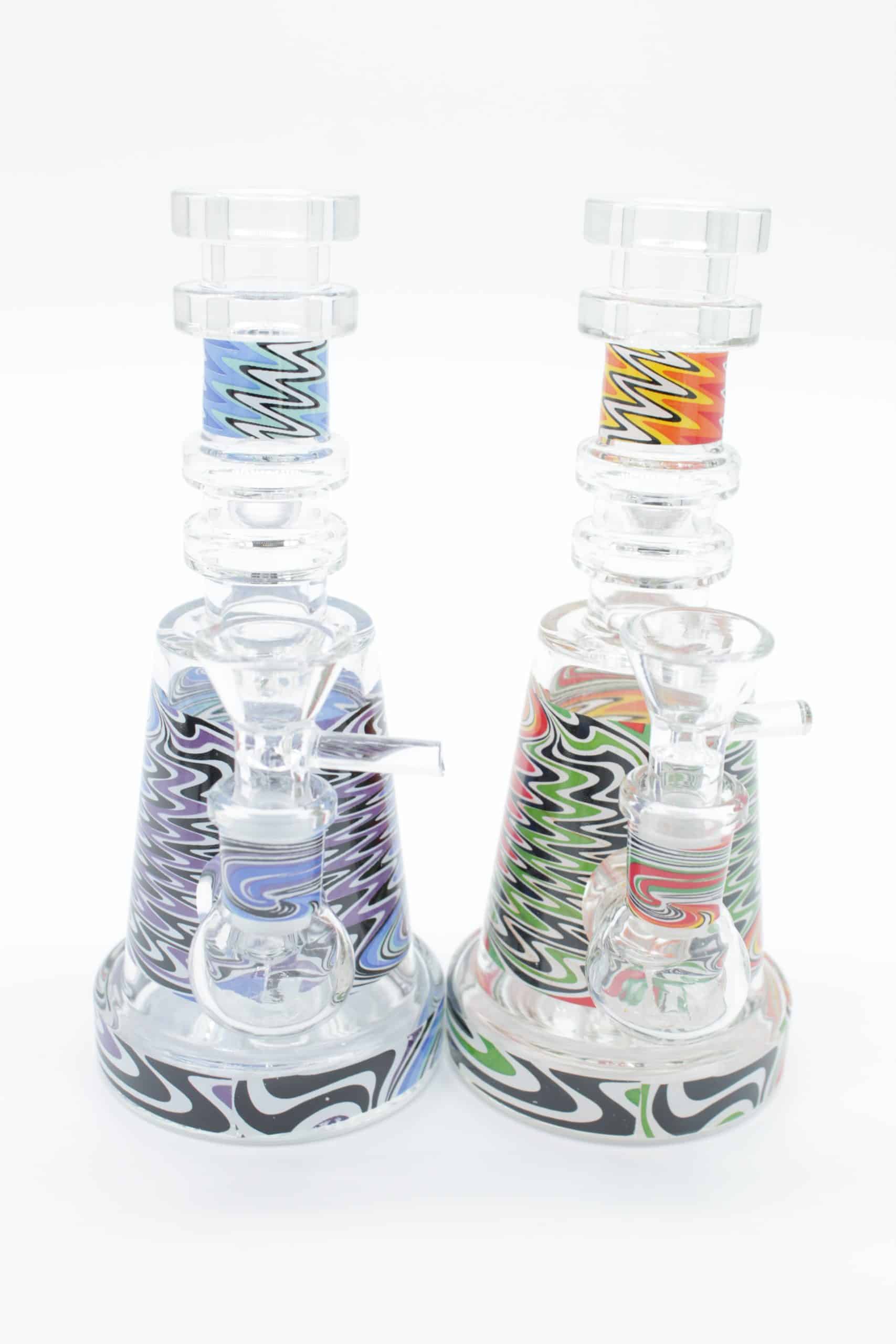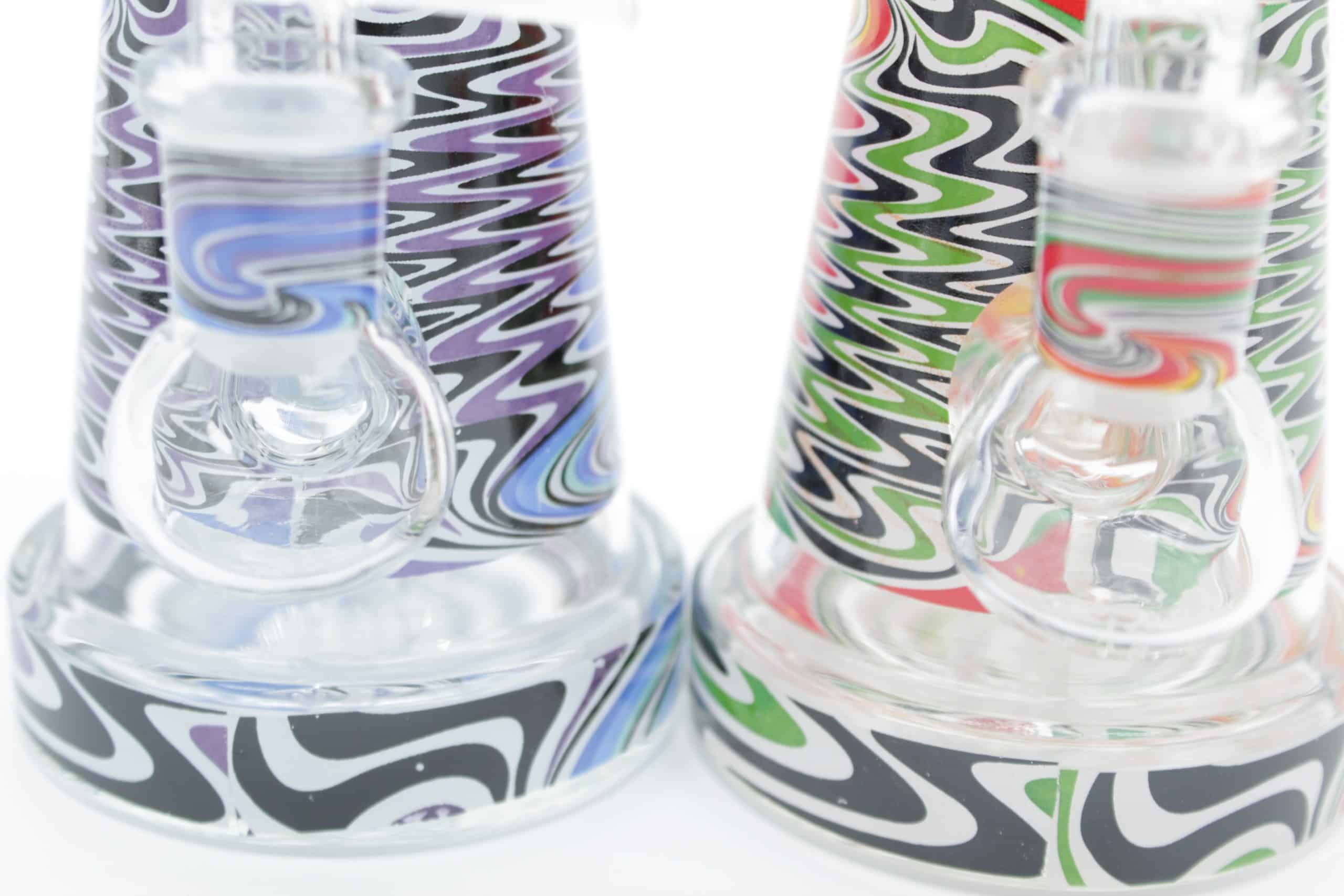 The design uses layered waves of bright colors that create a moving electric effect, giving this piece a modern psychedelic style while keeping a clean, premium appearance. Its smaller footprint makes it ideal for desktops, travel kits, shelves, or anyone who prefers a compact water pipe without sacrificing visual impact.