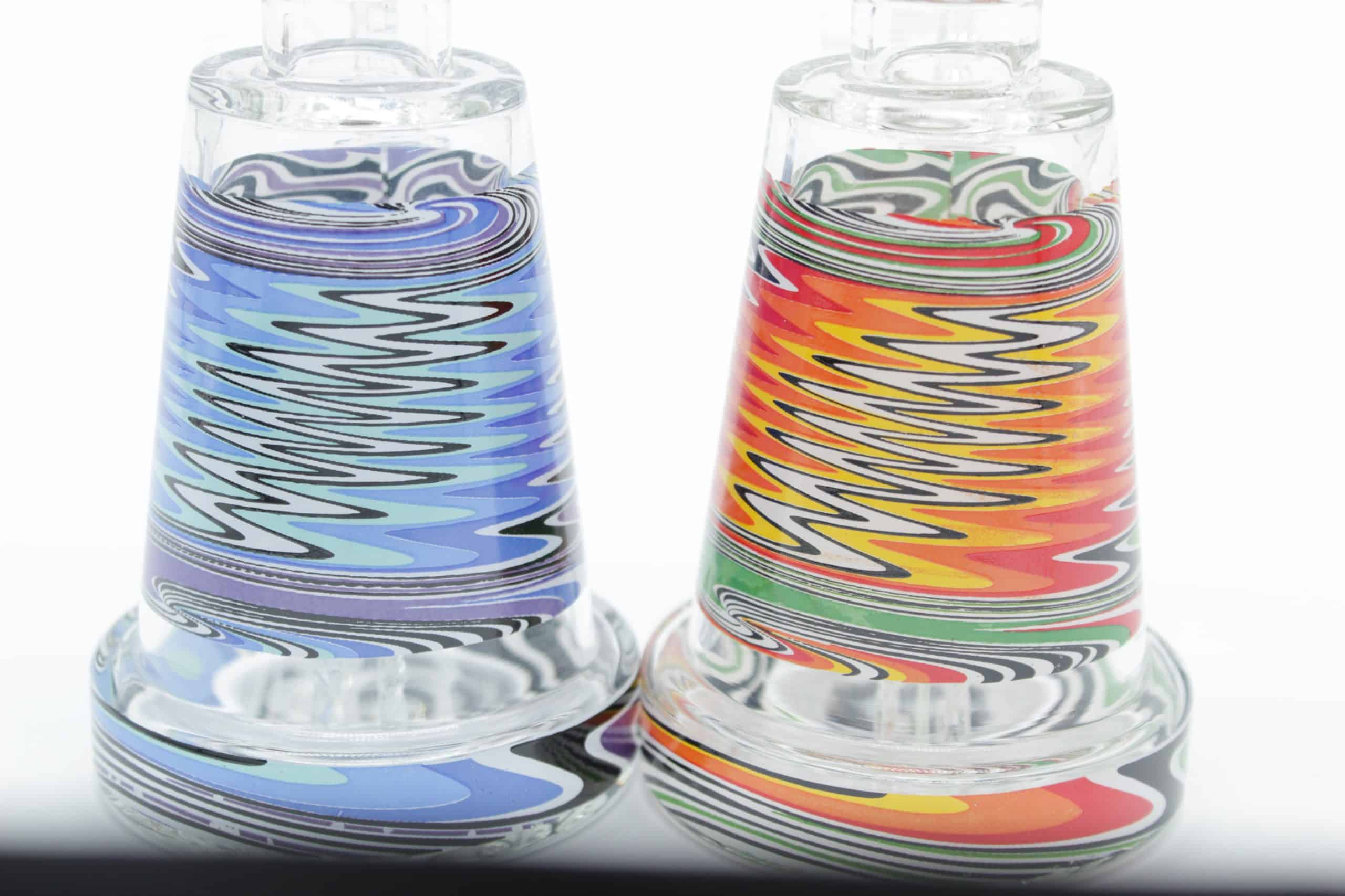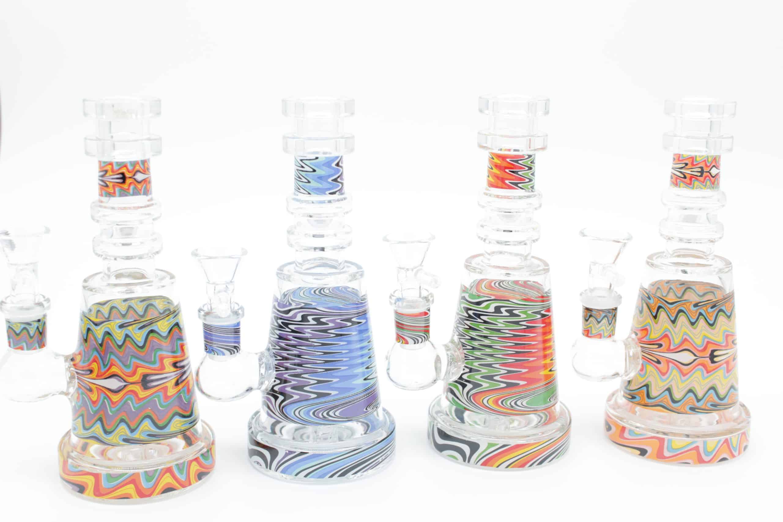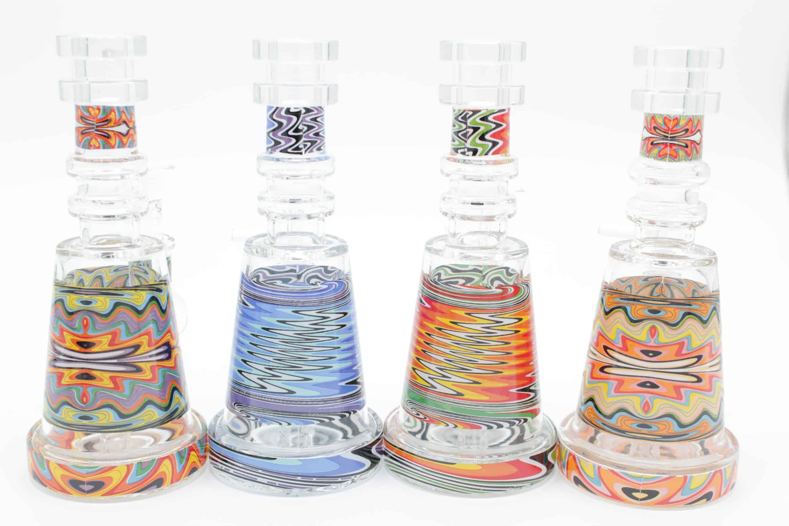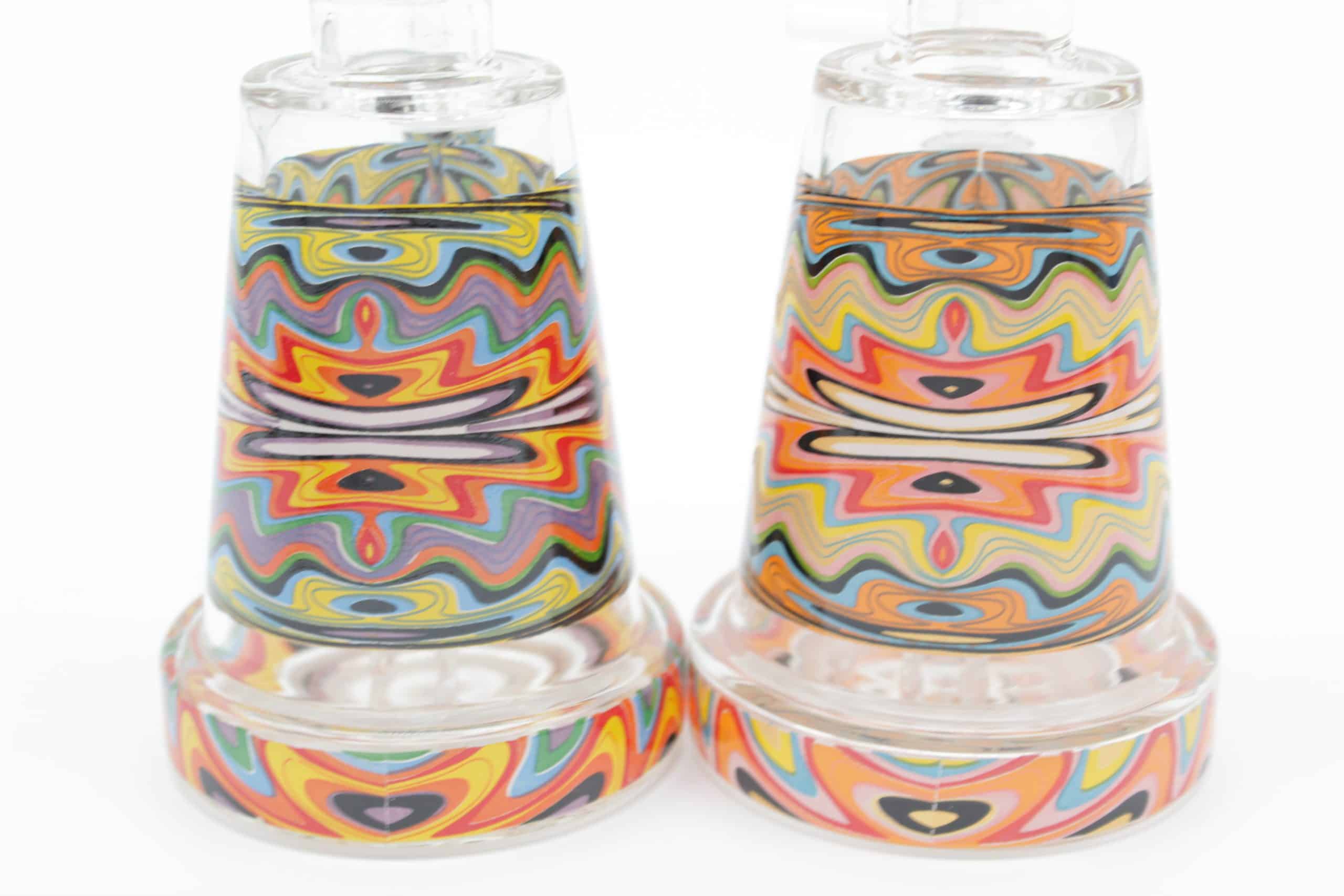 The design uses layered waves of bright colors that create a moving electric effect, giving this piece a modern psychedelic style while keeping a clean, premium appearance. Its smaller footprint makes it ideal for desktops, travel kits, shelves, or anyone who prefers a compact water pipe without sacrificing visual impact.
