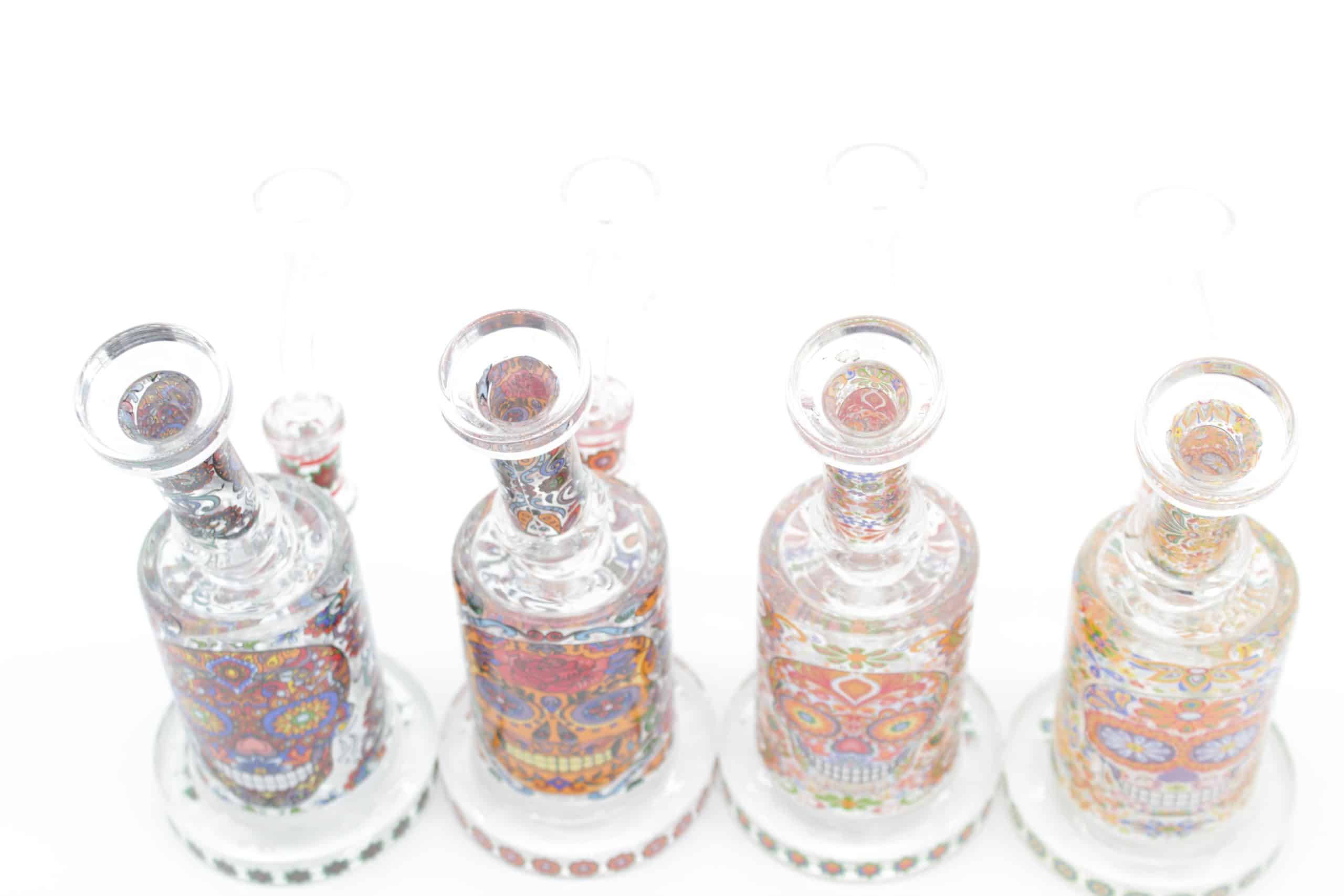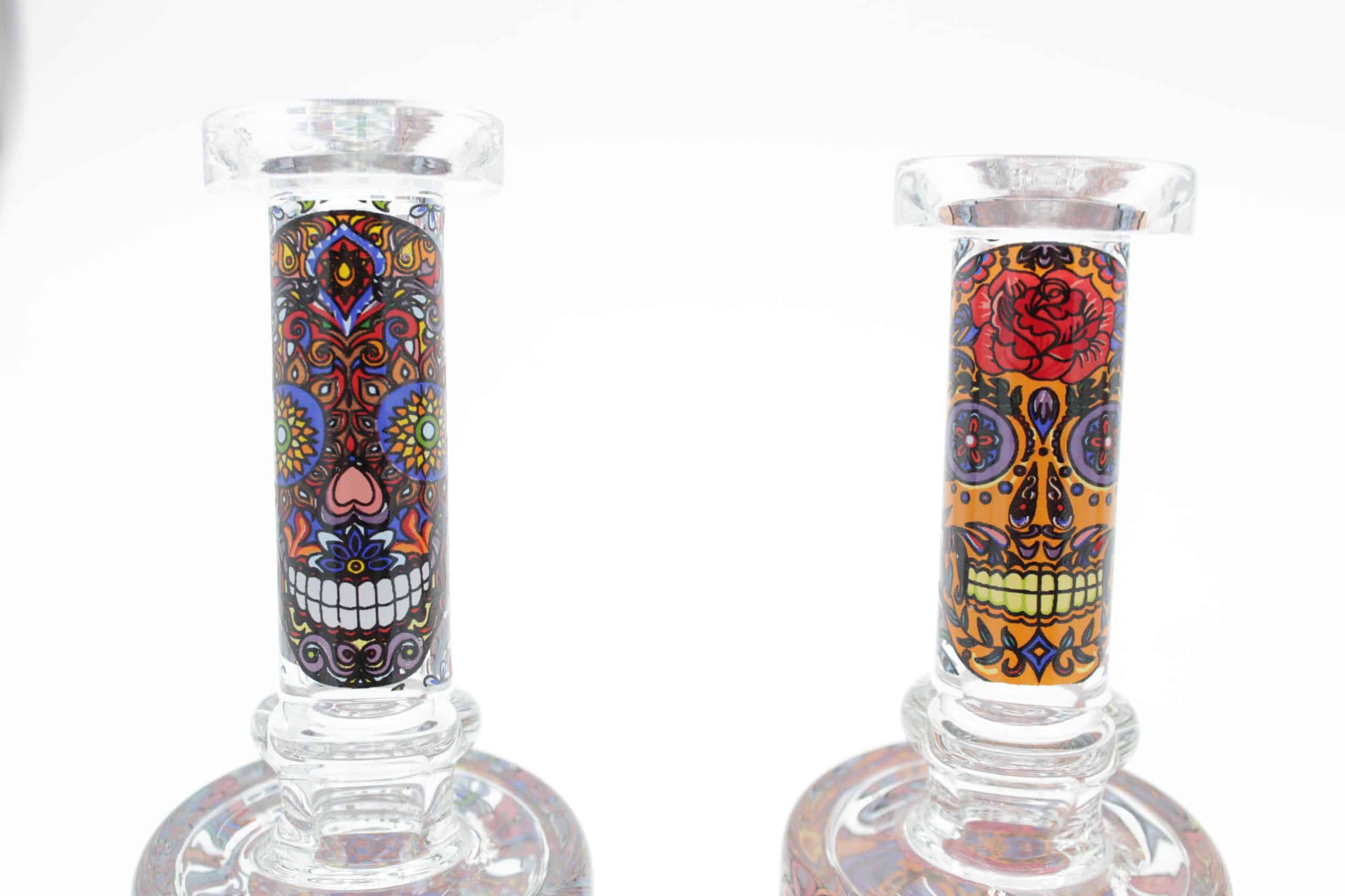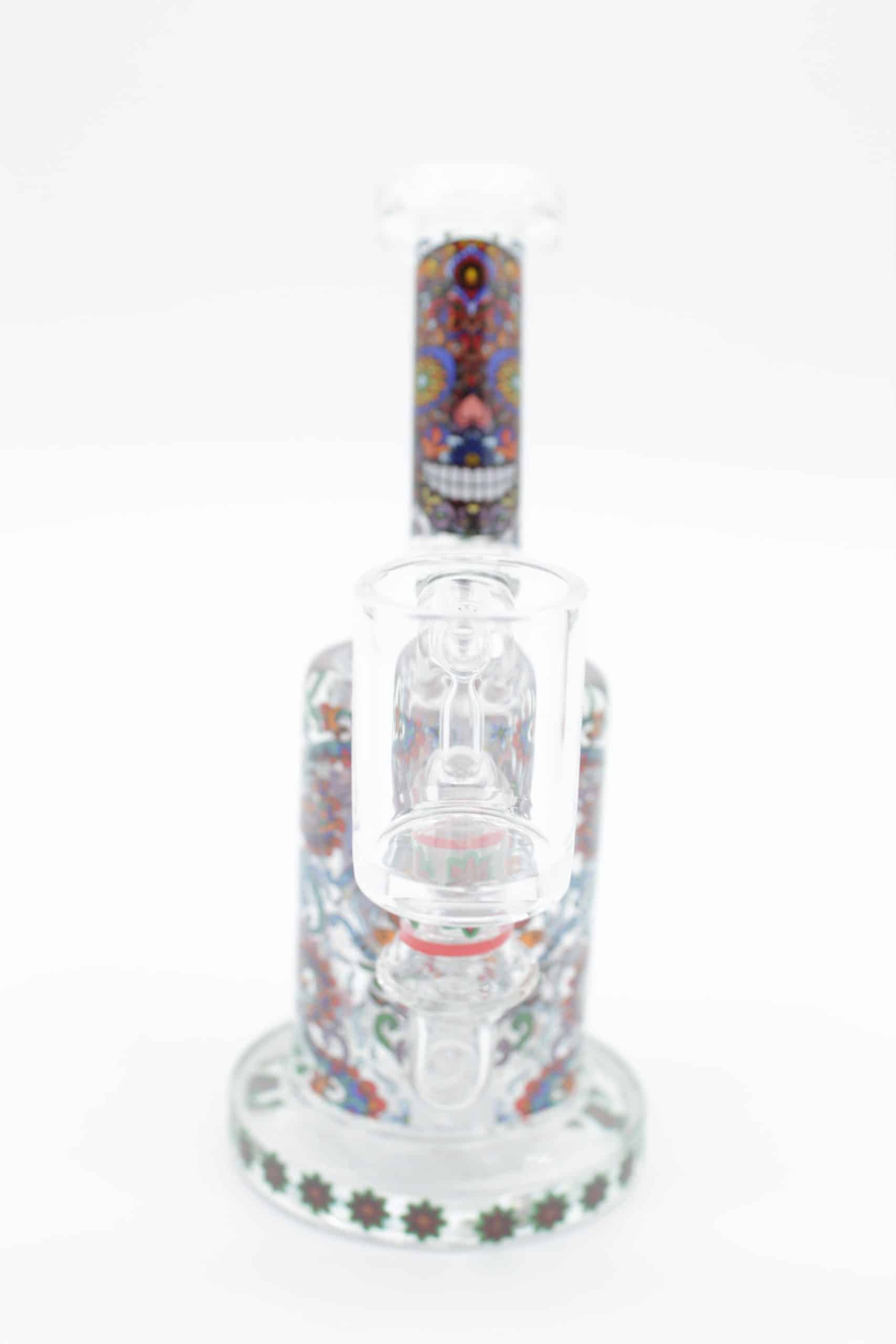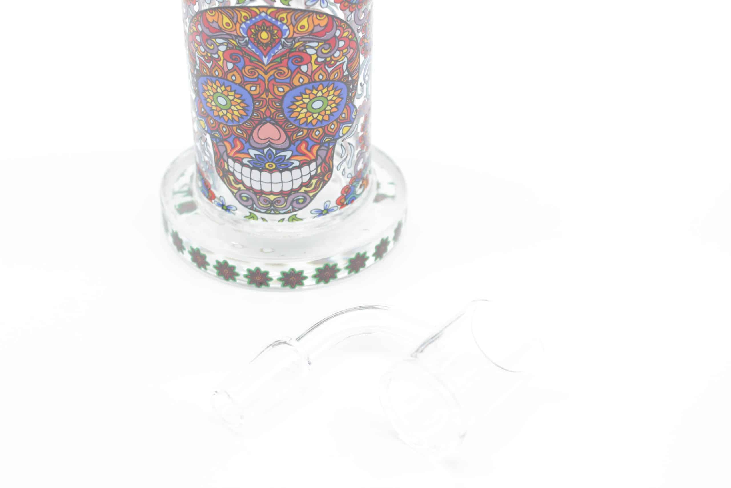 Designed with a sturdy cylindrical chamber and angled neck, this small dab rig offers comfortable handling, stable placement, and smooth airflow. The detailed mosaic skull graphics combine bright floral accents, vivid colors, and decorative patterns that create a clean premium look while adding serious visual appeal.