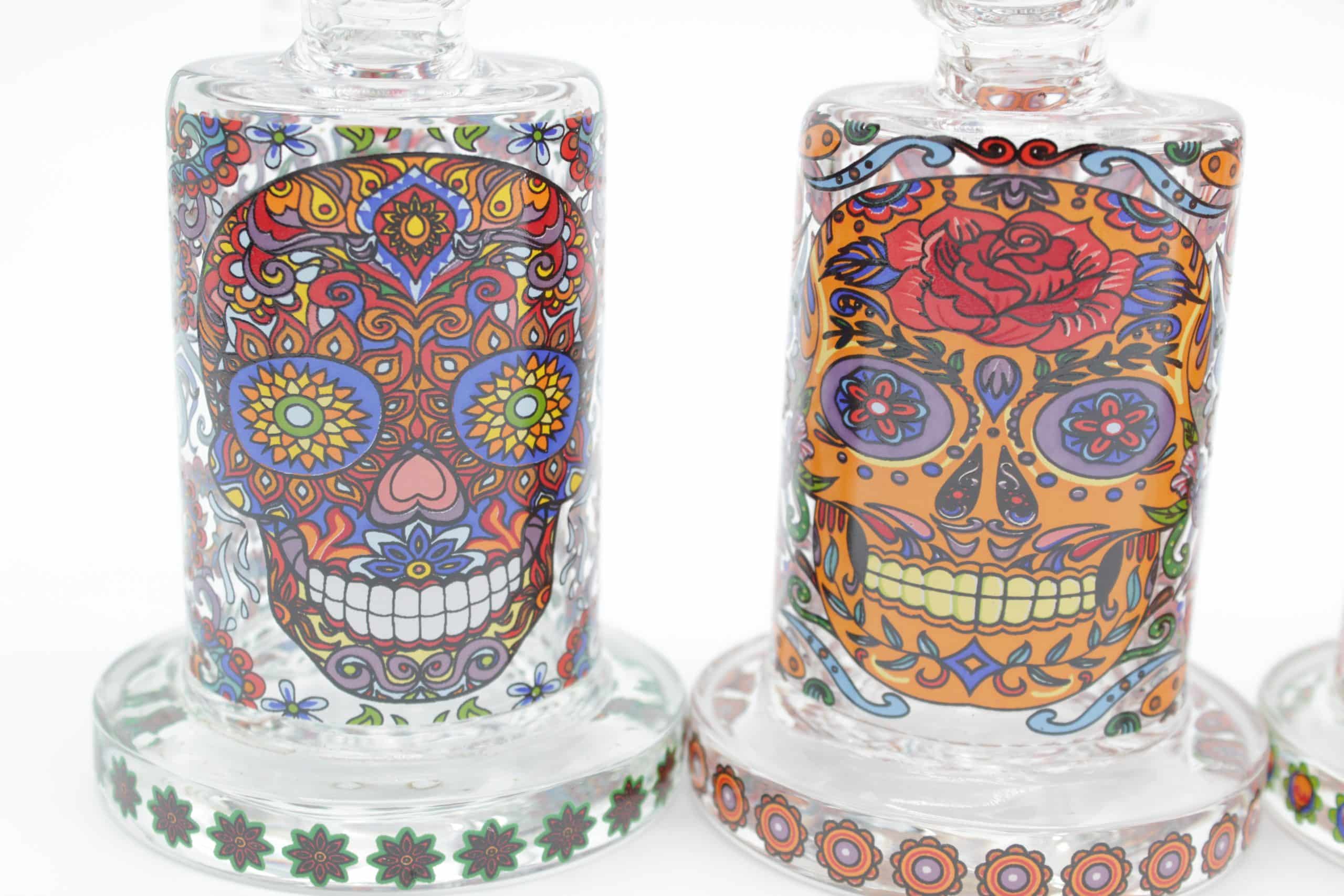 Detailed mosaic sugar skull graphics with floral and decorative accents.