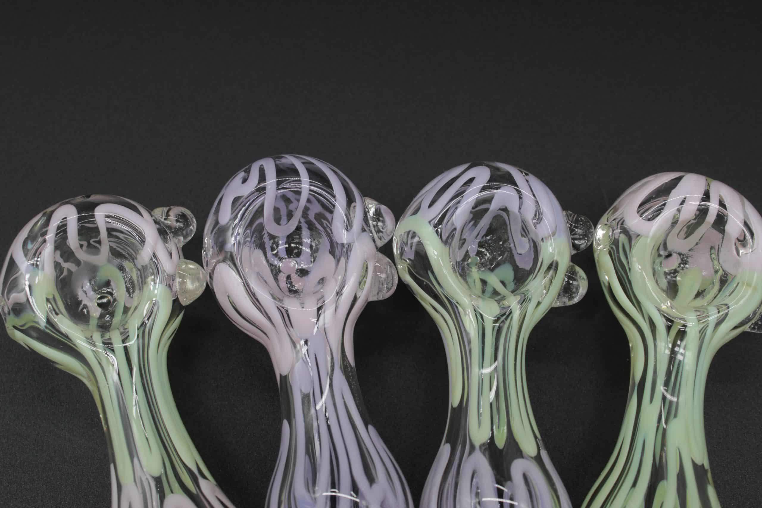 Add soft color and smooth function to your collection with this stylish Pastel Squiggle Glass Hand Pipe. Featuring flowing squiggle linework in light pastel tones over clear glass, this compact spoon pipe blends artistic design with everyday usability.