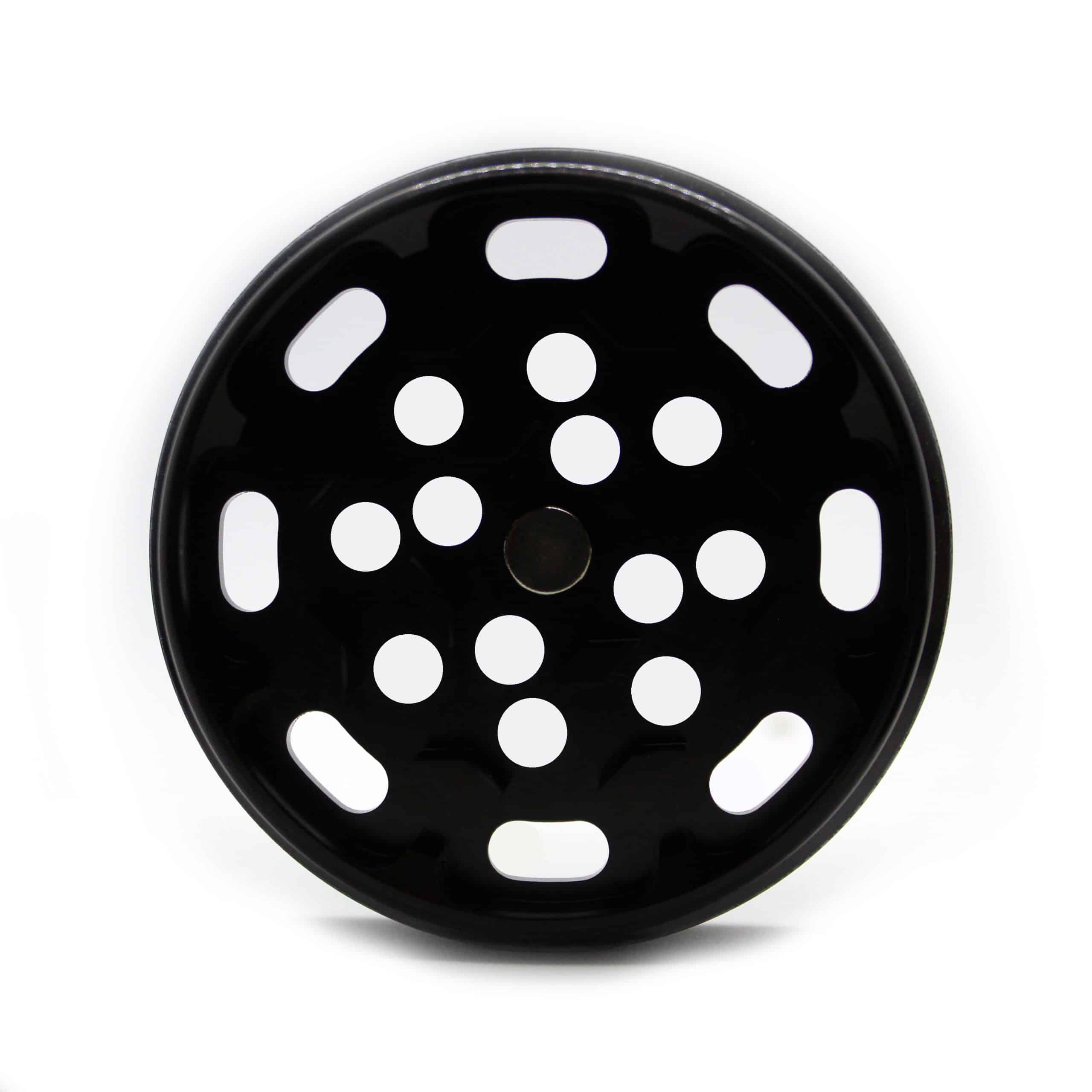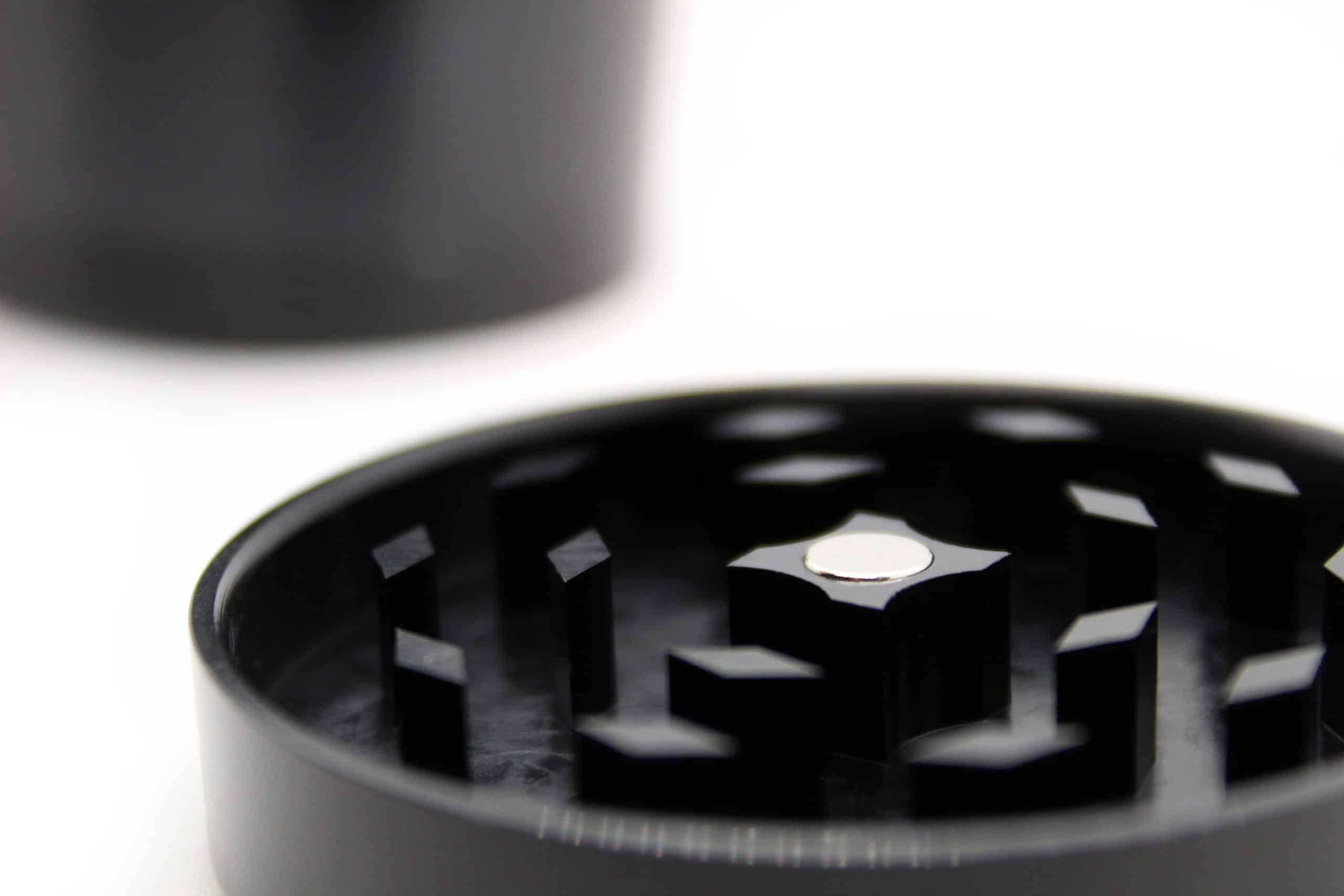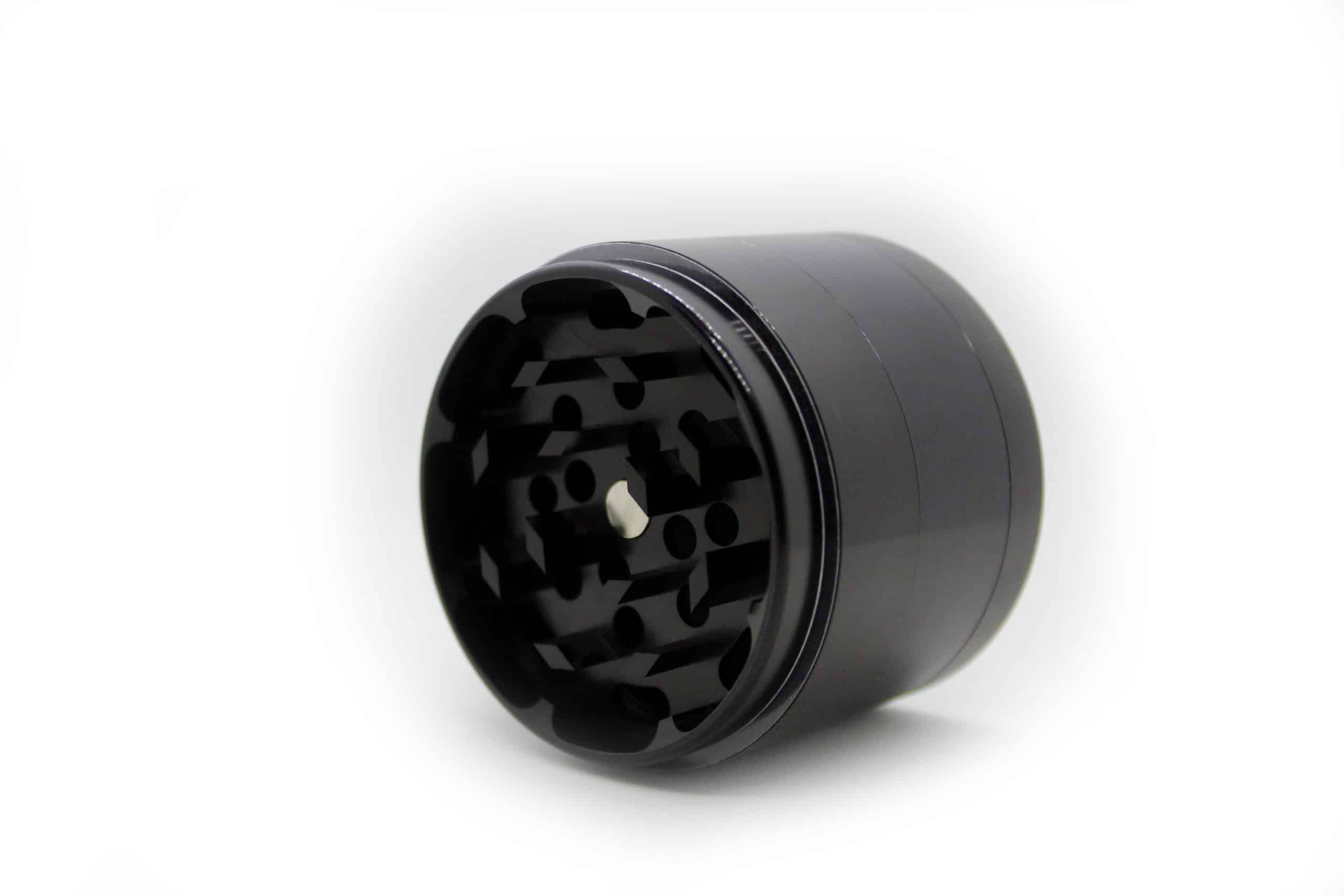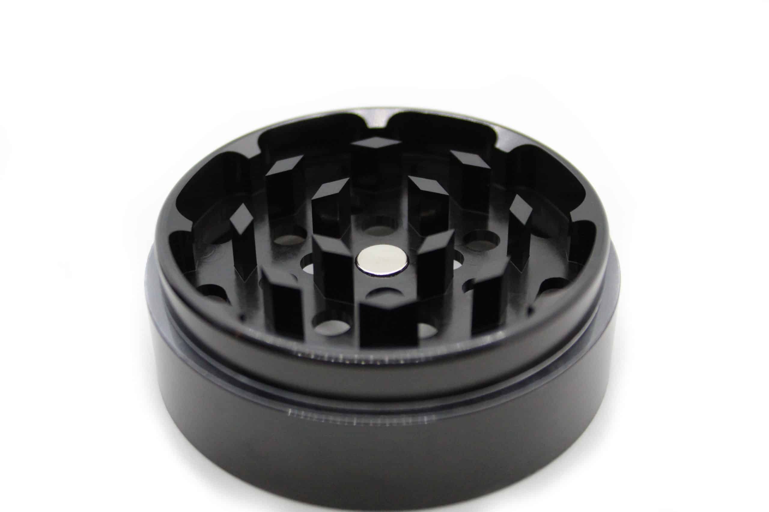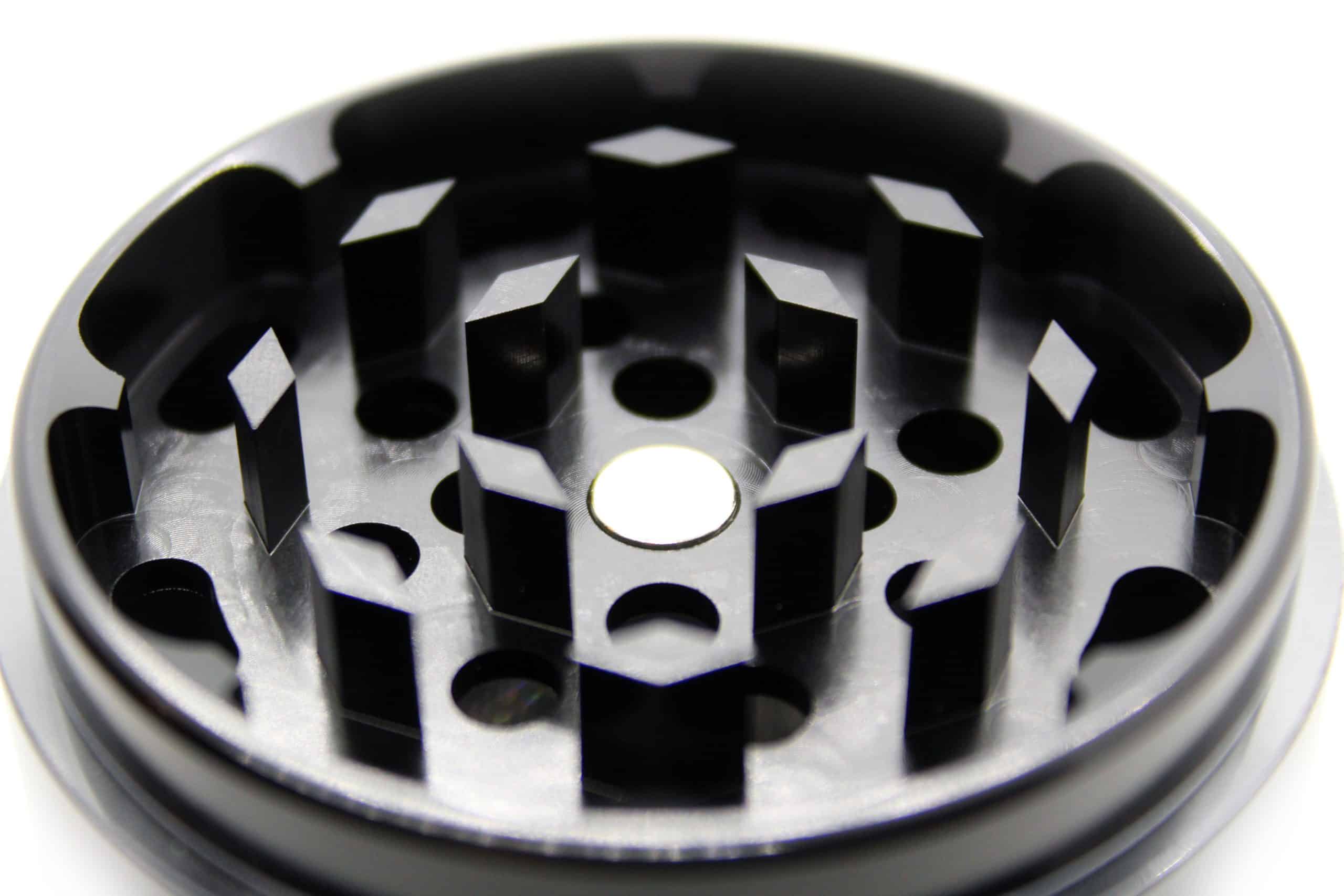 A strategically engineered pattern of oval and circular drop holes allows ground herb to fall smoothly into the storage chamber below, reducing resistance and buildup during grinding sessions. A powerful rare earth magnetic lid keeps the grinder securely aligned while allowing quick access.