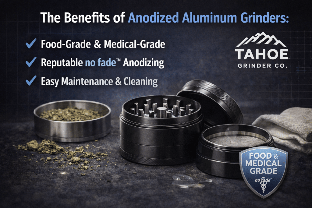 Anodized aluminum grinders, such as those offered by Tahoe Grinder Co., provide a range of benefits that set them apart. Firstly, the anodized coating used on our grinders is made from food-grade and medical-grade materials, ensuring safety and compliance with industry standards. This inert coating is non-reactive, meaning it won’t alter the flavor or quality of your herbs, providing a clean and enjoyable experience.