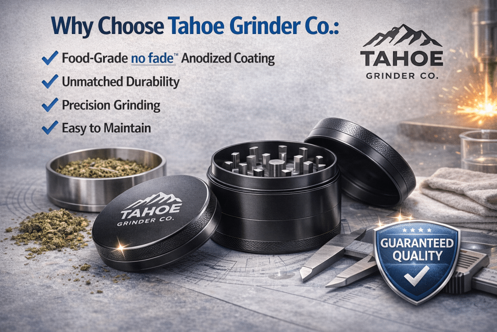 At Tahoe Grinder Co., we take pride in our commitment to quality and safety. All our grinders feature an inert food-grade no fadeâ„¢ anodized coating, ensuring your peace of mind while you enjoy your favorite herbs. We prioritize your health and satisfaction, and that’s why our grinders are crafted with meticulous attention to detail and undergo rigorous quality control checks.
